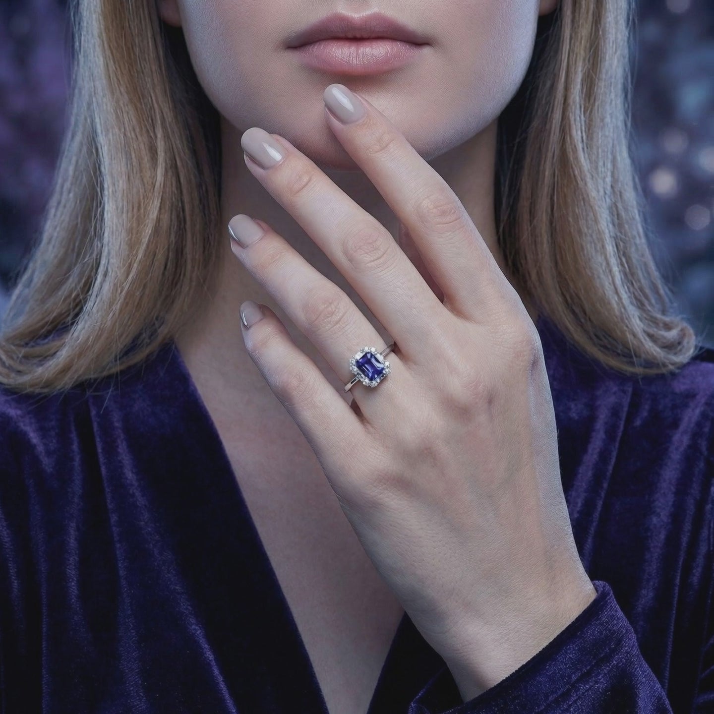 Side profile of the Elisande emerald cut simulated tanzanite sterling silver ring on purple velvet.