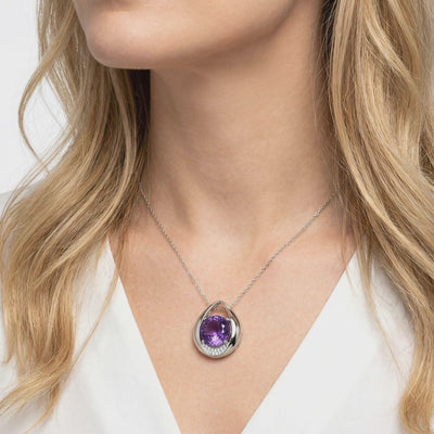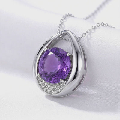 Close-up of the S925 sterling silver Isolde drop necklace featuring a vibrant round cut simulated amethyst.