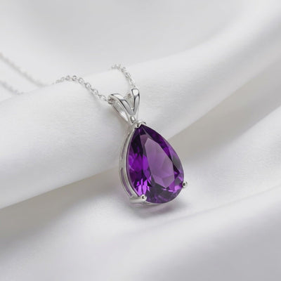 Close-up of a pear-cut purple moissanite necklace in a silver V-bale setting on white fabric.