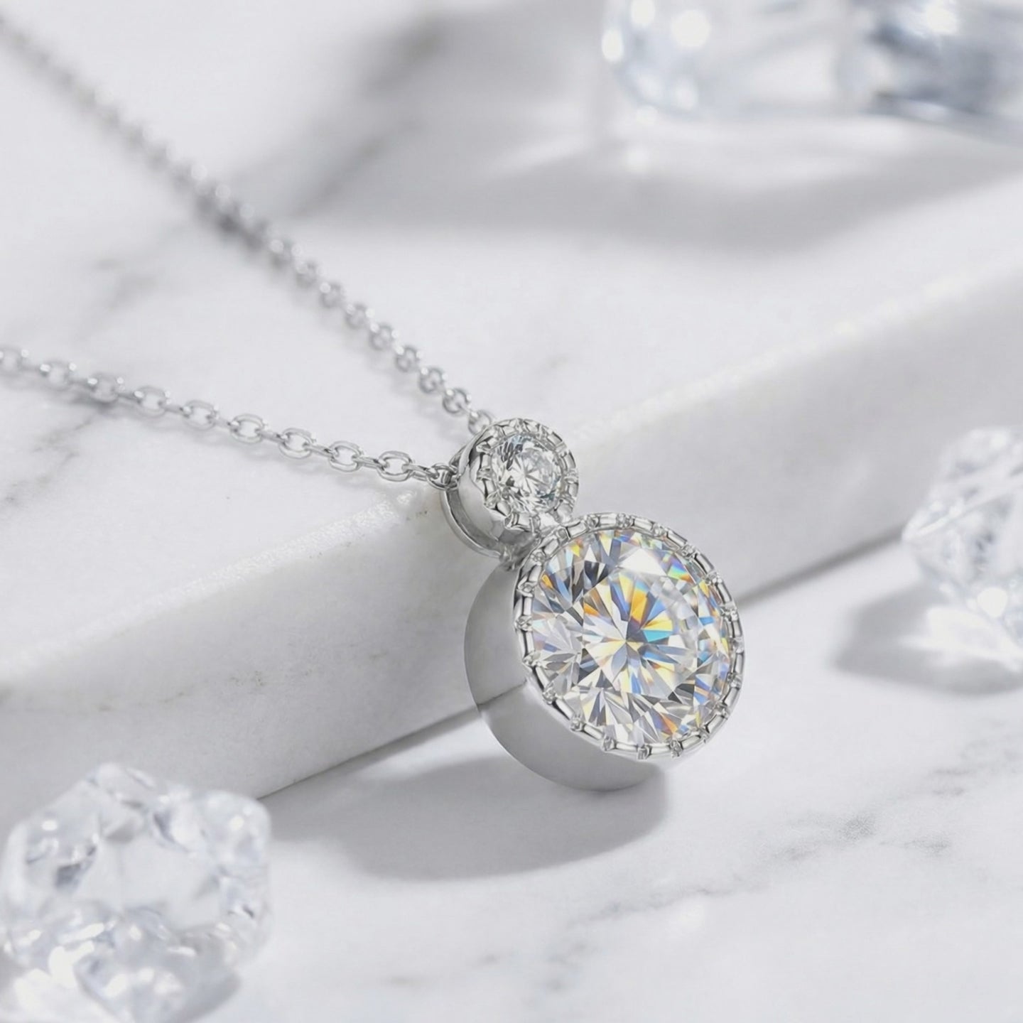 Frontal view of the sterling silver Luciana necklace with round-cut simulated diamonds on a marble surface.