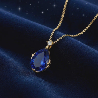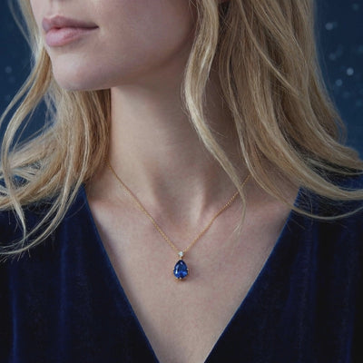 Side profile of the pear-cut simulated sapphire pendant in 18K gold vermeil on blue velvet.