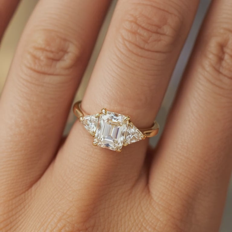 - The unique triangular side stones perfectly frame the center emerald cut, creating a balanced and striking visual appeal.