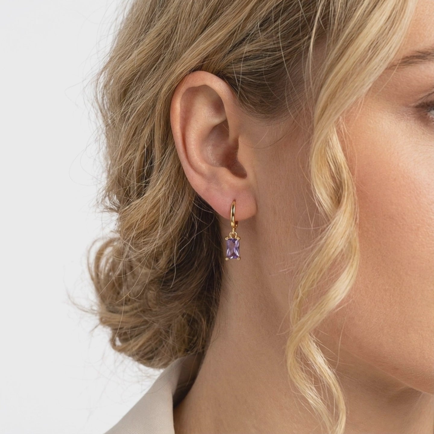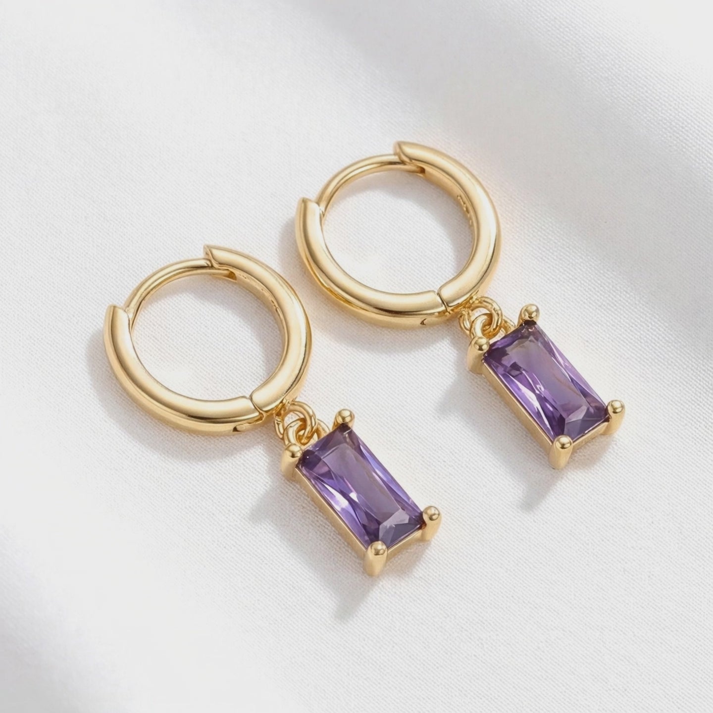 Sterling silver hoop earrings with emerald cut simulated amethyst drops resting on white fabric.
