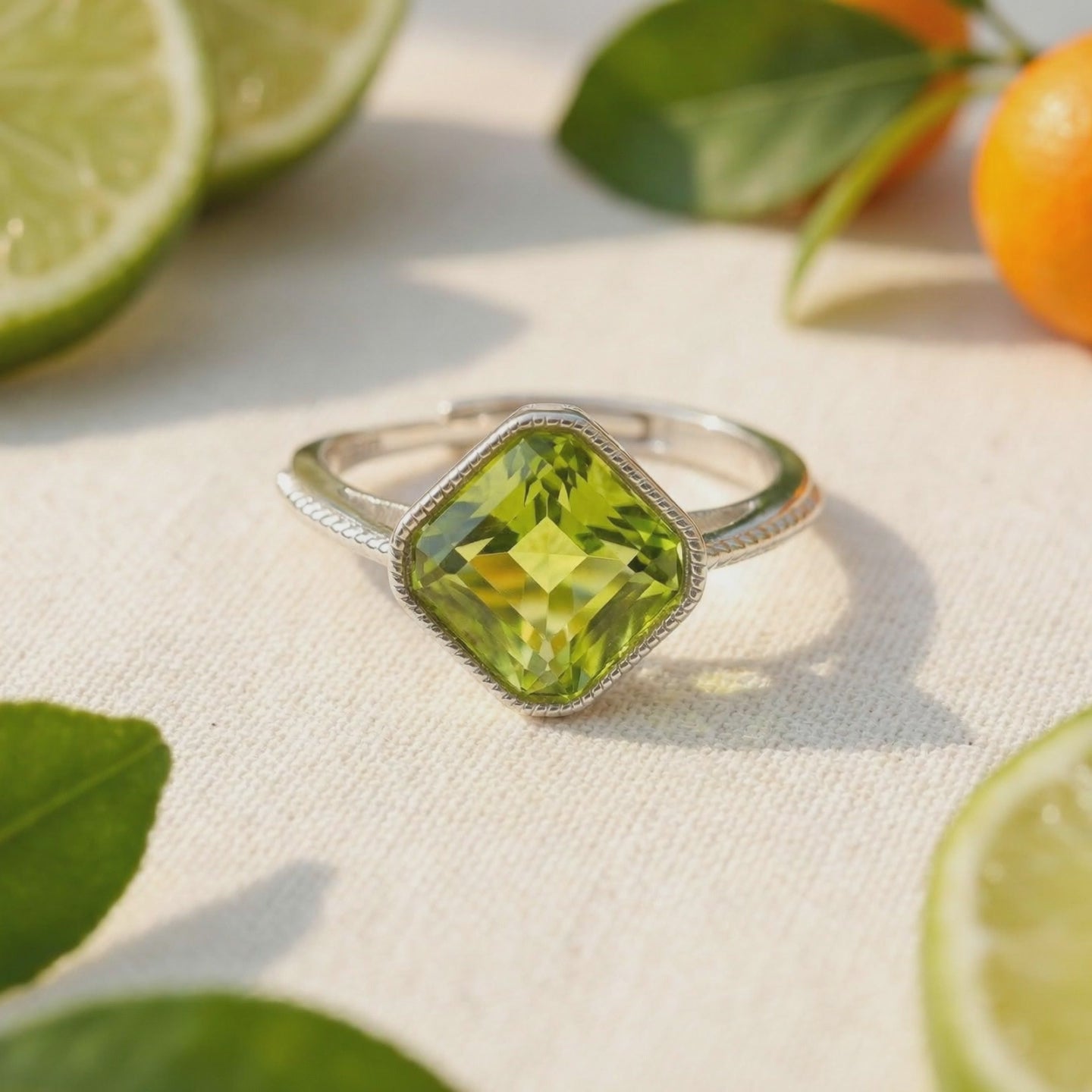 Natural peridot is often riddled with inclusions and inconsistent hues. This August birthstone ring features a Simulated Peridot, engineered to match the ideal "Vibrant Lime" benchmark. Each stone is precision-cut into an 8x8mm square silhouette for maximum light return and edge-to-edge clarity, delivering the visual impact of a museum-grade gemstone.