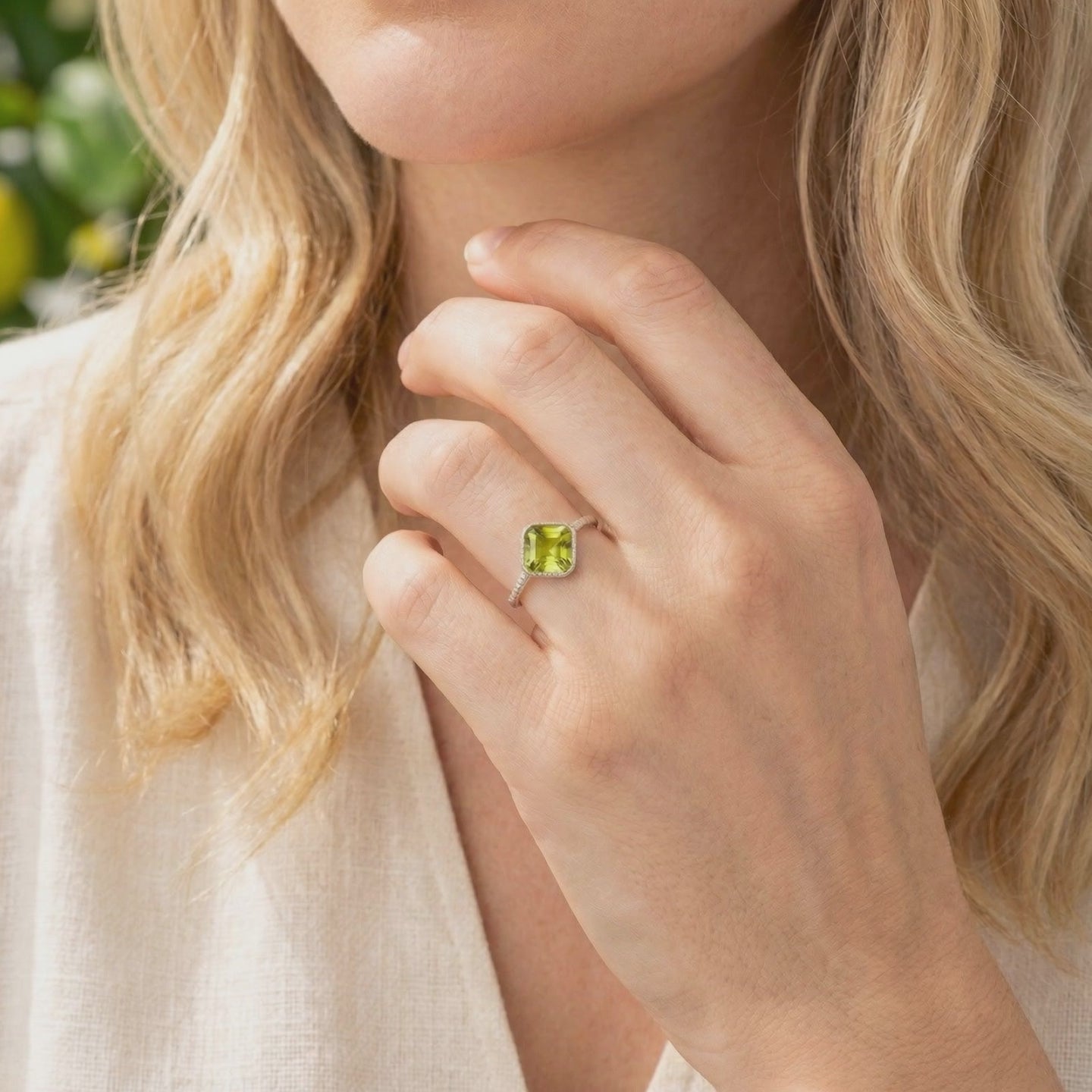 - Center Stone: 8x8mm Square Cut Simulated Peridot (A5 Grade)