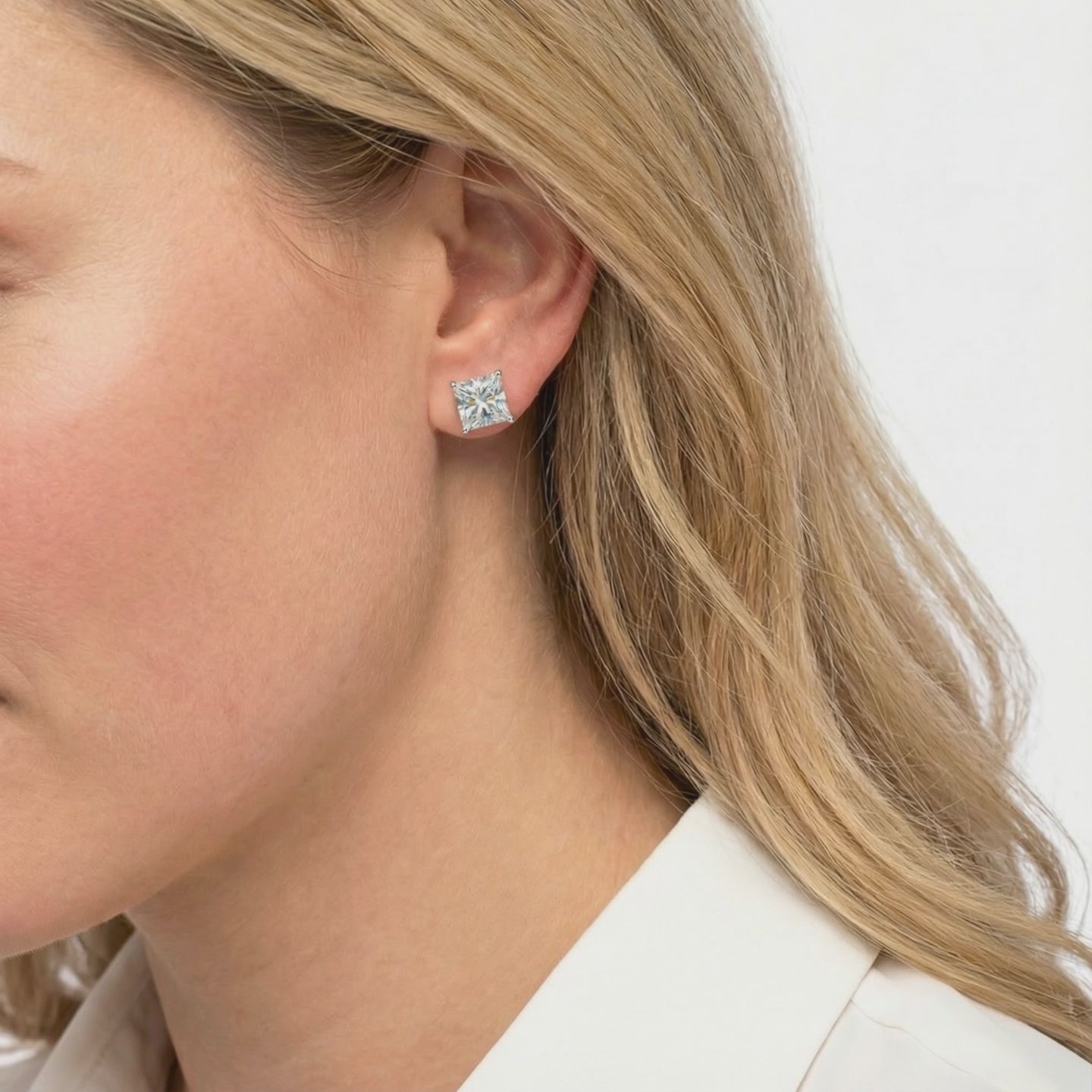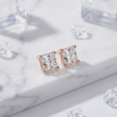 Close-up of princess cut zirconia stud earrings in 18K rose gold vermeil showing the four-prong setting and facets.