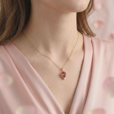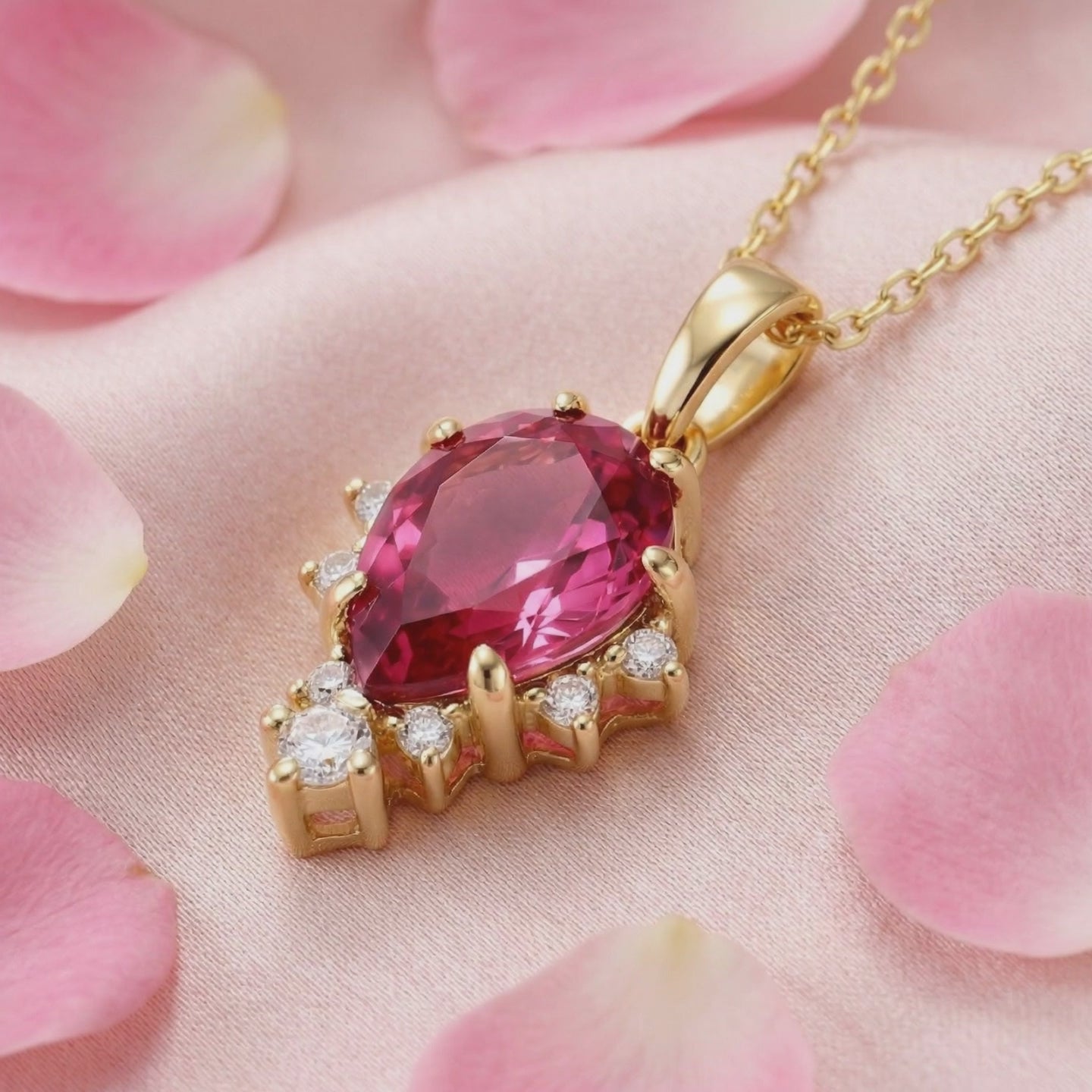 Side view of the pear-cut simulated pink tourmaline pendant in 18K gold vermeil showing the setting.