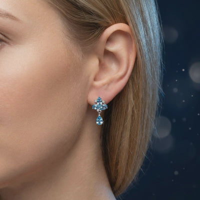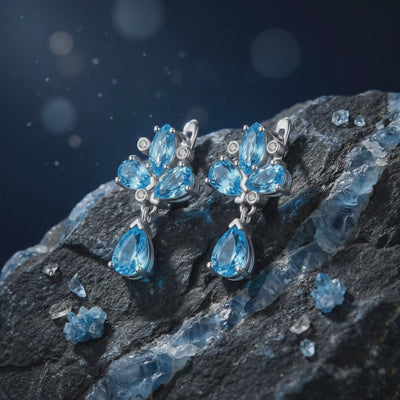 You don't need an occasion to wear an extraordinary masterpiece. These drop earrings feature a substantial cluster of certified natural topaz, expertly faceted in precision pear and marquise cuts. Because natural topaz possesses exceptional, eye-clean transparency, our lapidaries utilize these dynamic cuts to allow light to travel deeply into the stones, refracting a vivid, electric blue hue that catches the light from across the room. Achieved through safe, permanent, industry-standard color enhancement, this vivid oceanic saturation will remain brilliant for a lifetime.