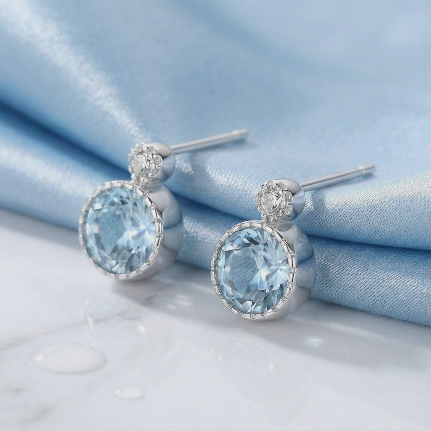 Mined aquamarines are often pale or cloudy. These stud earrings feature high-performance Simulated Aquamarine, color-calibrated to match the deep, serene light blue of museum-grade stones. Precision-cut from A5 Grade material, they are engineered for maximum fire and refractive performance.