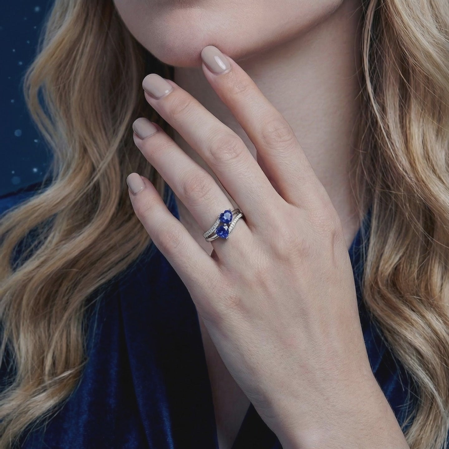 Nature is random; engineering is precise. Mined sapphires are often clouded by inclusions or vary wildly in shade. This September birthstone ring features two heart-cut Simulated Sapphires, color-calibrated to match the ideal deep royal blue with velvety saturation found in museum-grade specimens. We don't settle for "good enough"—we replicate the absolute peak of visual physics.