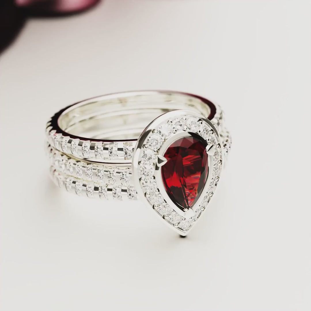 Lágrima carmesí: anillo con halo de rubí tallado en forma de pera - S925