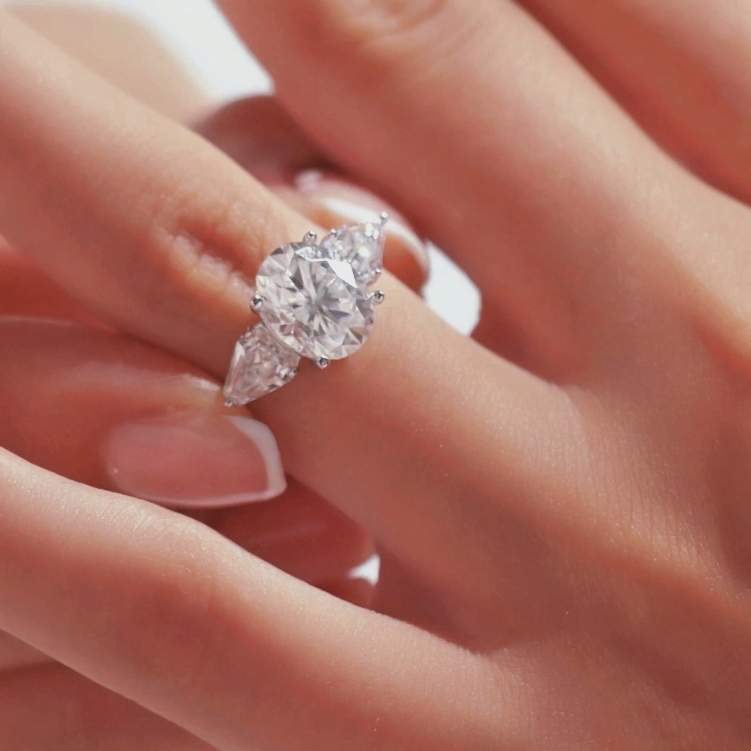 El Evelyn presenta una brillante piedra de moissanita de corte ovalado en un engarce seguro con garras, complementada con piedras decorativas triangulares. Su diseño lujoso pero simple es ideal tanto para uso diario como para ocasiones especiales, y simboliza el amor y la unidad.