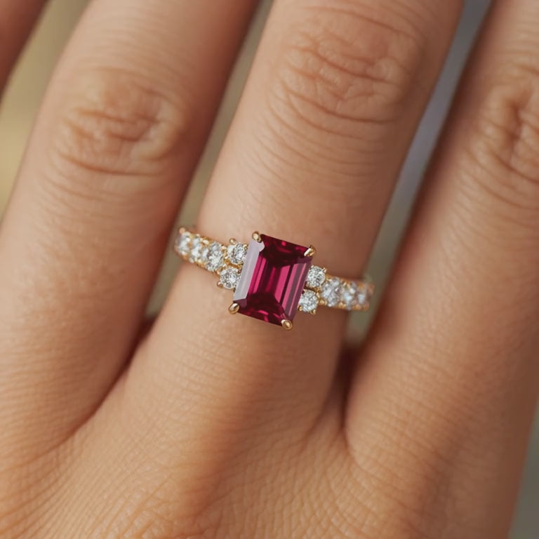 With breathtaking emerald-cut red moissanite that captures the light like no other, this ring is both luxurious and affordable. The band is adorned with pavé side stones, adding an exquisite touch that complements the centerpiece. It's the ring that turns heads and invites admiration, offering a refined sparkle that speaks of bold sophistication.