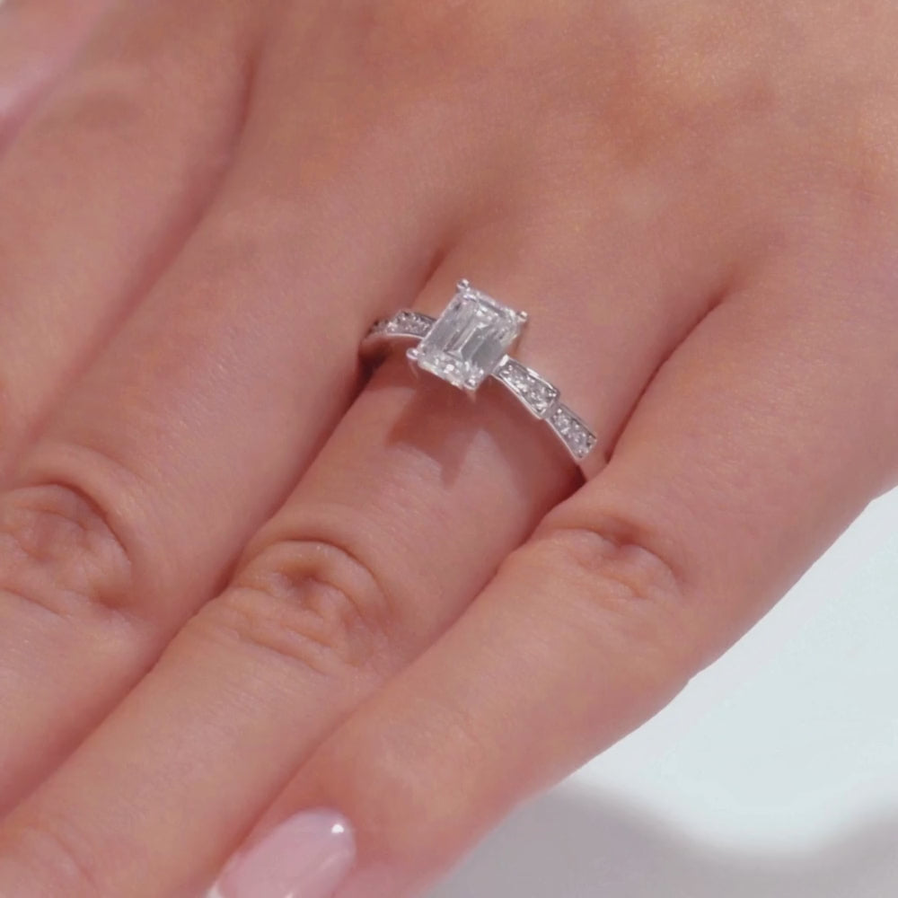 El anillo Aurora cuenta con un diamante moissanita de talla esmeralda engastado en una banda de plata esterlina S925 de primera calidad. El brillo radiante y el diseño impecable de este anillo lo convierten en el accesorio perfecto para cualquier ocasión, ya sea un evento especial, un día en la oficina o una velada romántica.