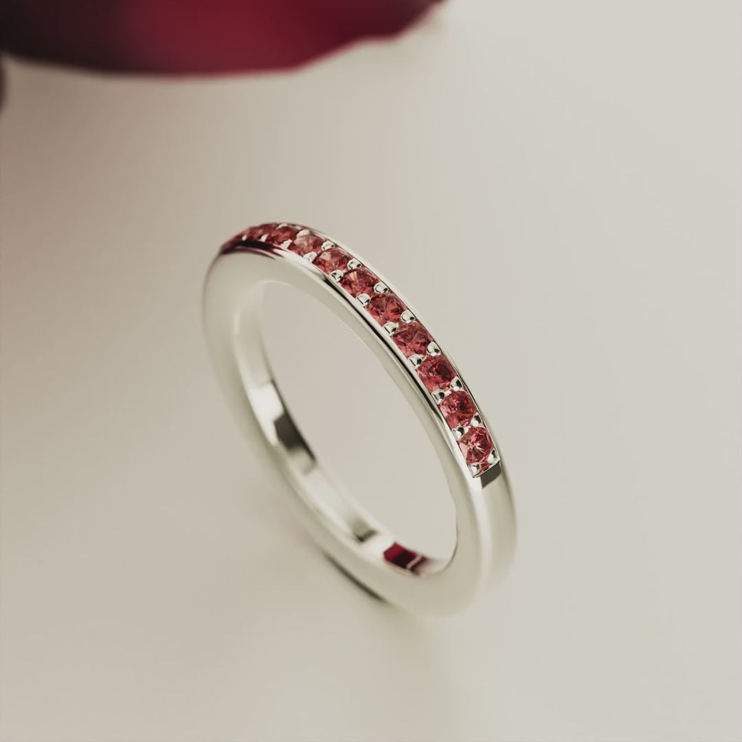 Piedras brillantes y relucientes se encuentran fijadas en un engaste de canal en esta banda de anillo de media eternidad. Debajo, tiene una banda de plata de primera calidad con 4 capas de platino para una mayor durabilidad y brillo.