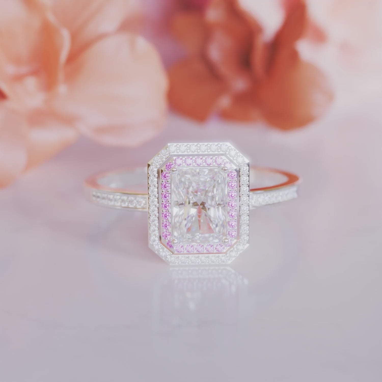 - Rodeado de un hermoso halo brillante de diamantes simulados de color rosa y blanco.