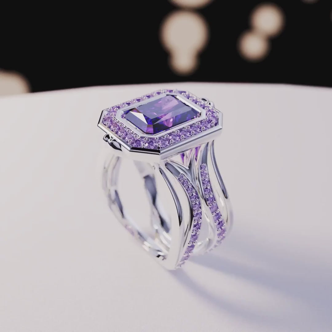Una amatista simulada hermosa y llamativa se asienta como una corona en el centro de un halo de piedras preciosas. Los lados están cubiertos con hermosos diamantes simulados y esmalte violeta. Debajo hay plata de primera calidad con 4 capas de platino para una mayor durabilidad y brillo.