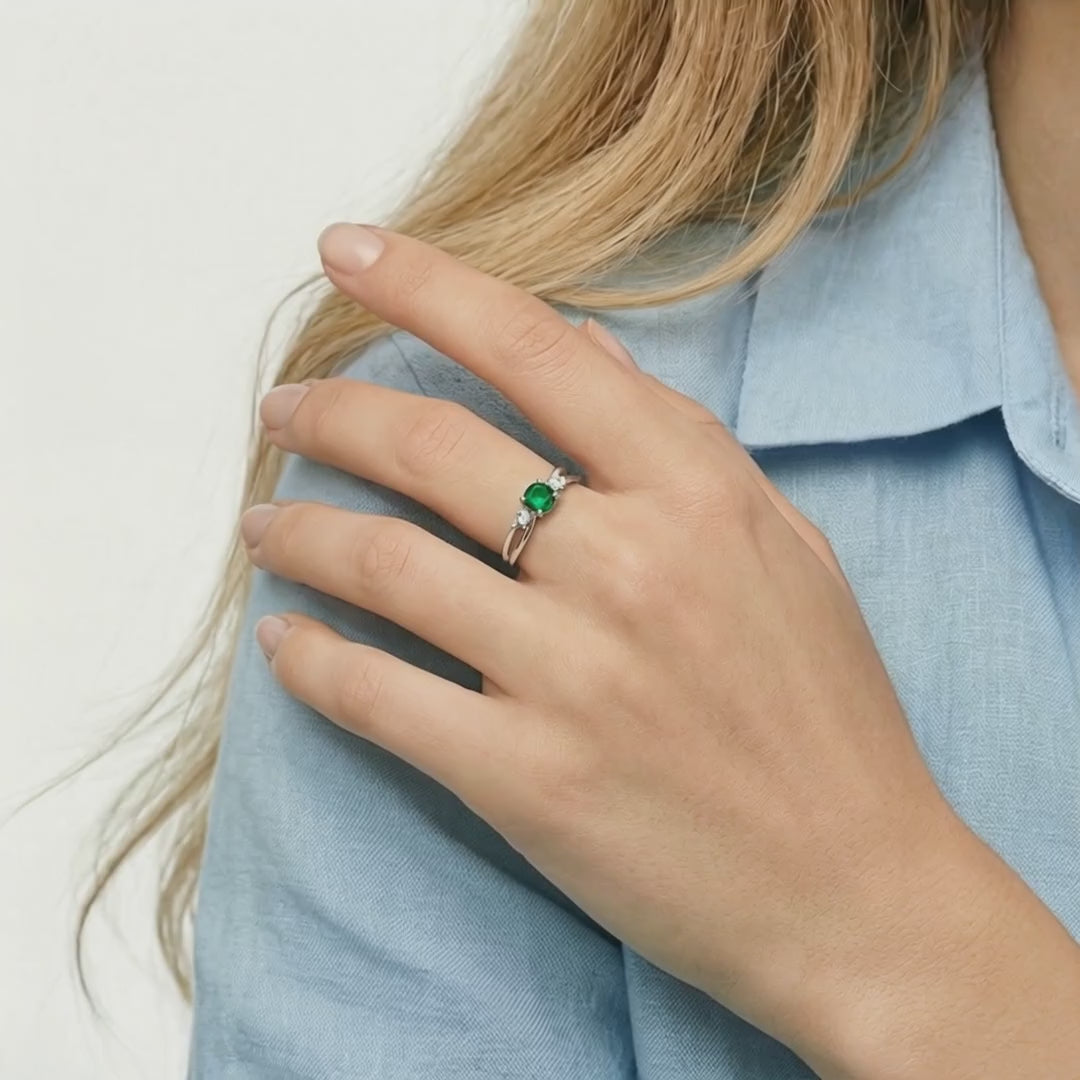 OfertaSterling silver bow ring with trillion-cut simulated emeralds on green velvet with eucalyptus leaves.