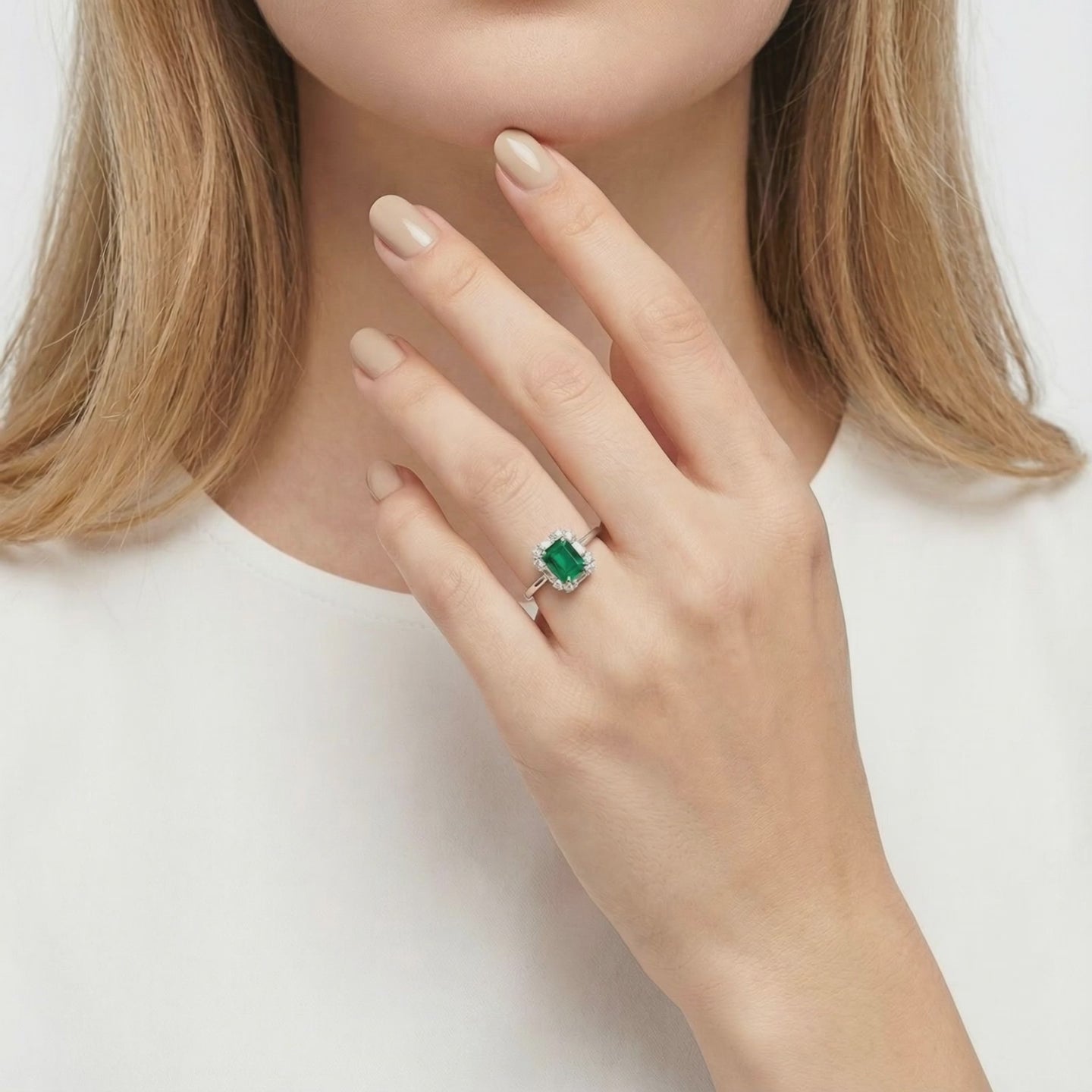 OfertaOctagon cut simulated emerald ring in sterling silver with a halo setting on green velvet with eucalyptus leaves.