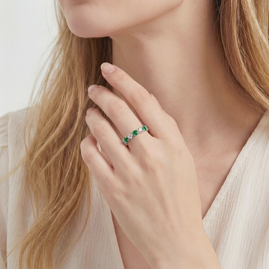 OfertaMacro view of an S925 silver half-eternity ring with round-cut simulated emeralds and clear stones on green velvet.