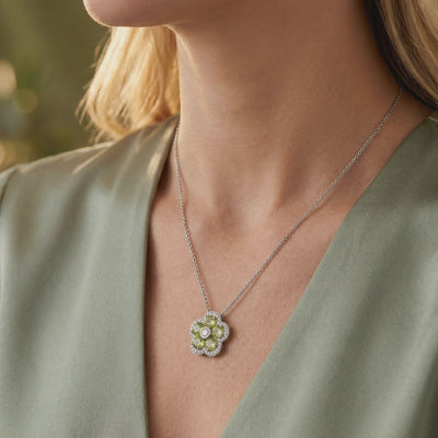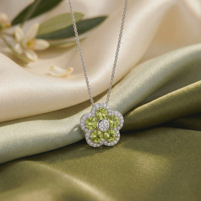 Celebrate the vibrancy of nature with a design that captures the eternal freshness of spring. This exquisite pendant features a cluster of five round-cut Natural Peridot gemstones, arranged in a delicate floral formation that radiates the electric lime-green glow of the "Evening Emerald."
