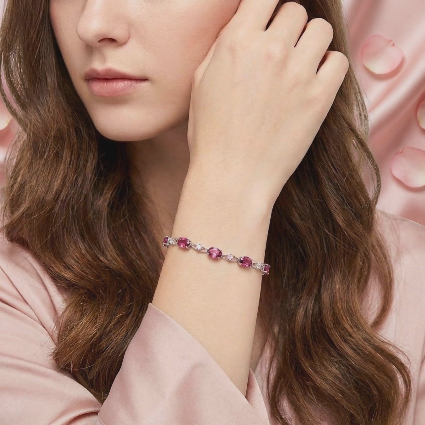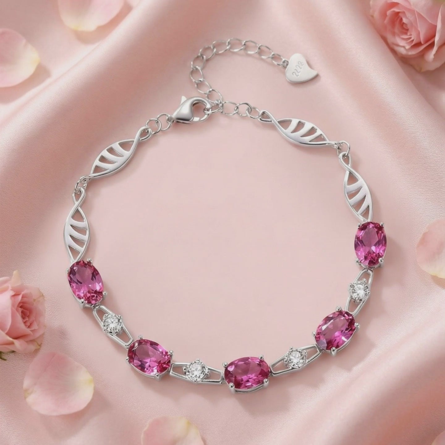 Macro view of oval-cut simulated pink tourmaline stones and silver leaf links on a sterling silver bracelet.