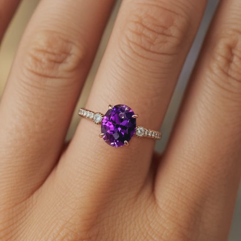 This ring isn't just jewelry; it's a moment she'll cherish forever. The centerpiece is a magnificent purple moissanite, embodying royal elegance and your unique devotion. SurOvaling it, a band adorned with shimmering stones creates a galaxy of light on her finger.