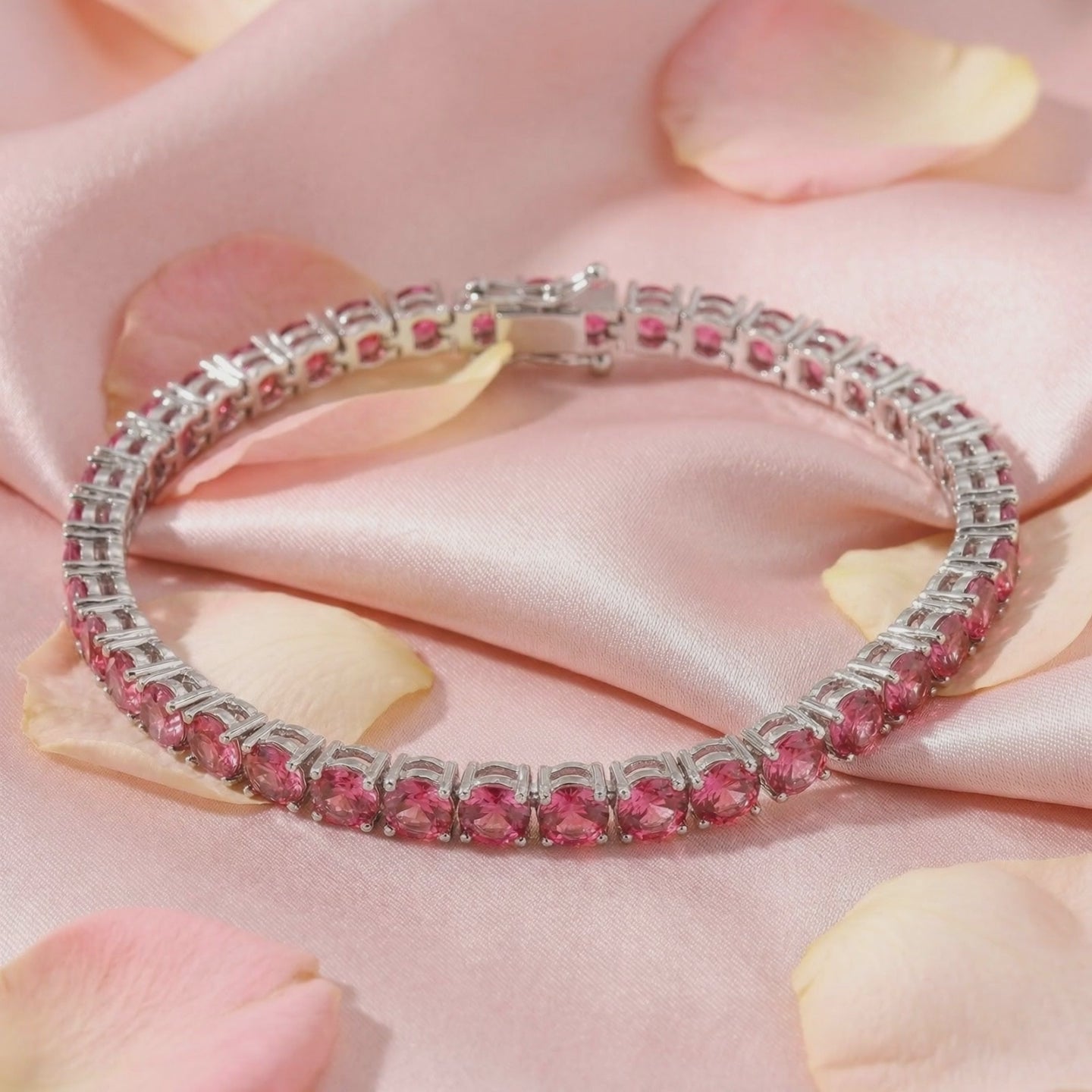 Heart-cut pink tourmaline necklace in sterling silver with a halo setting, resting on pink silk and rose petals.
