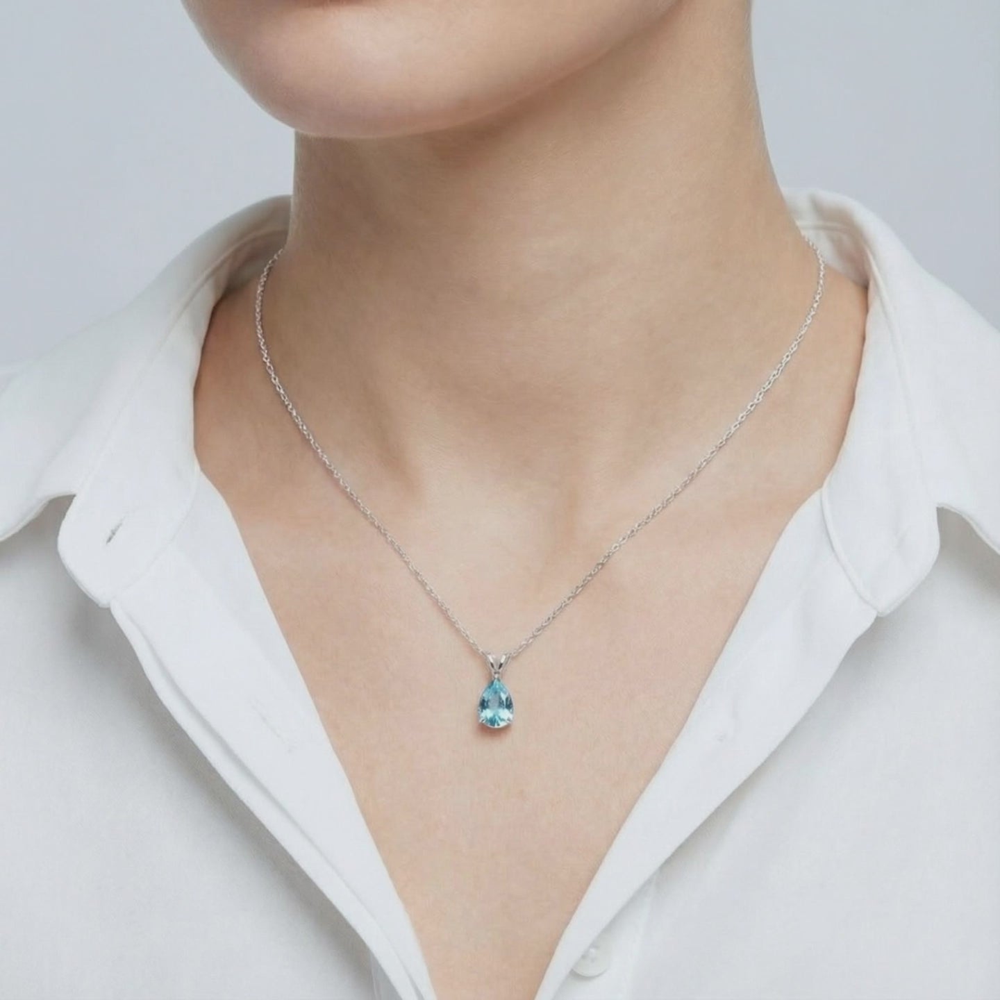 PromoPear cut simulated aquamarine necklace in sterling silver displayed on blue silk and white marble.