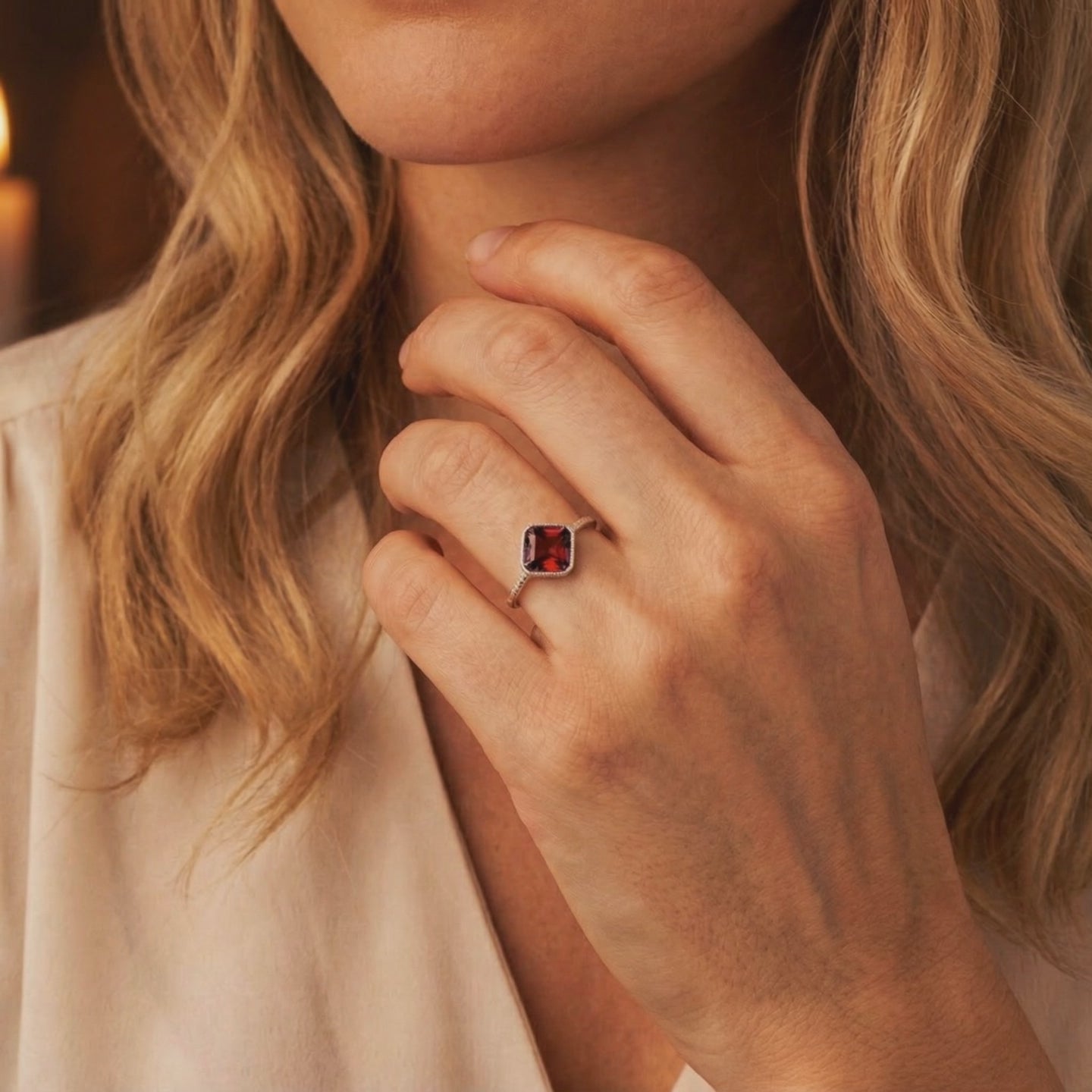 Nature rarely delivers perfection, but engineering does. This cushion-cut ring features a Simulated Garnet, color-calibrated to achieve the ideal deep red saturation that defines the January birthstone. Precision-cut from A5 Grade material, the center stone offers flawless clarity and maximum light return without the cloudiness often found in mined gems.