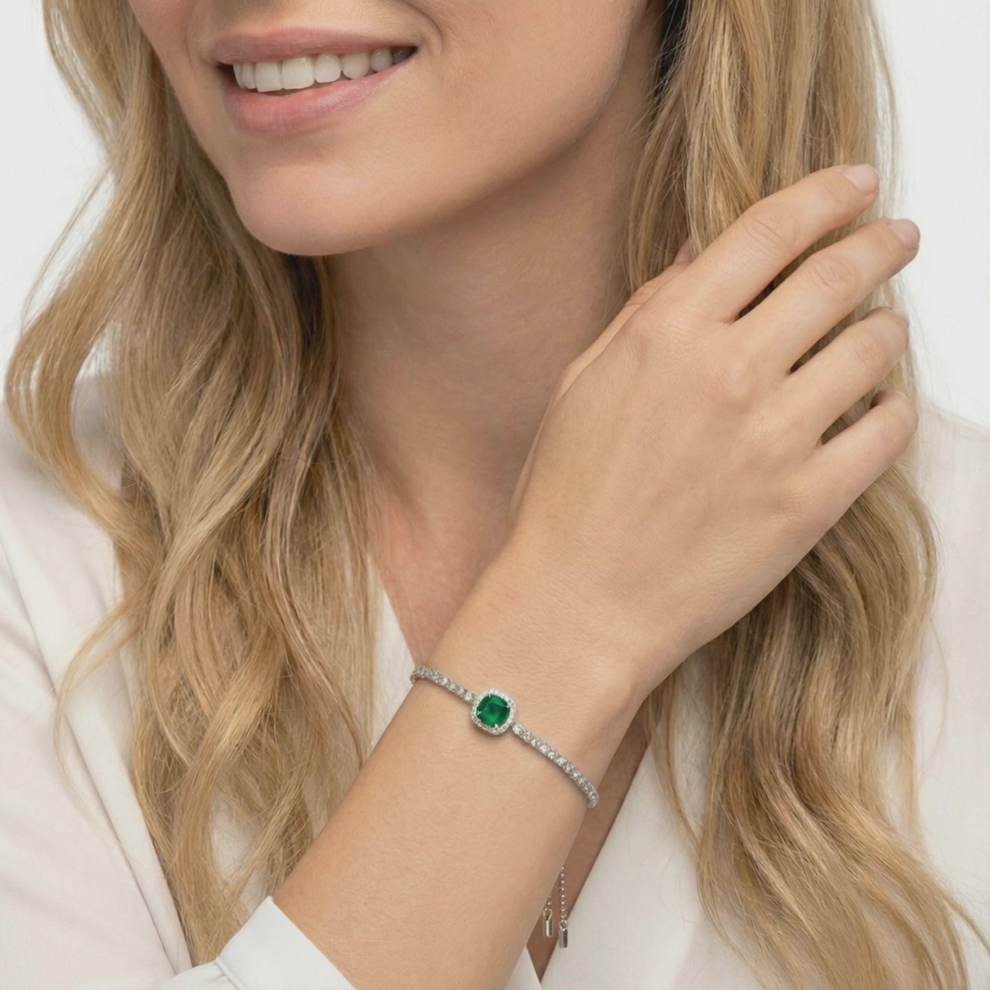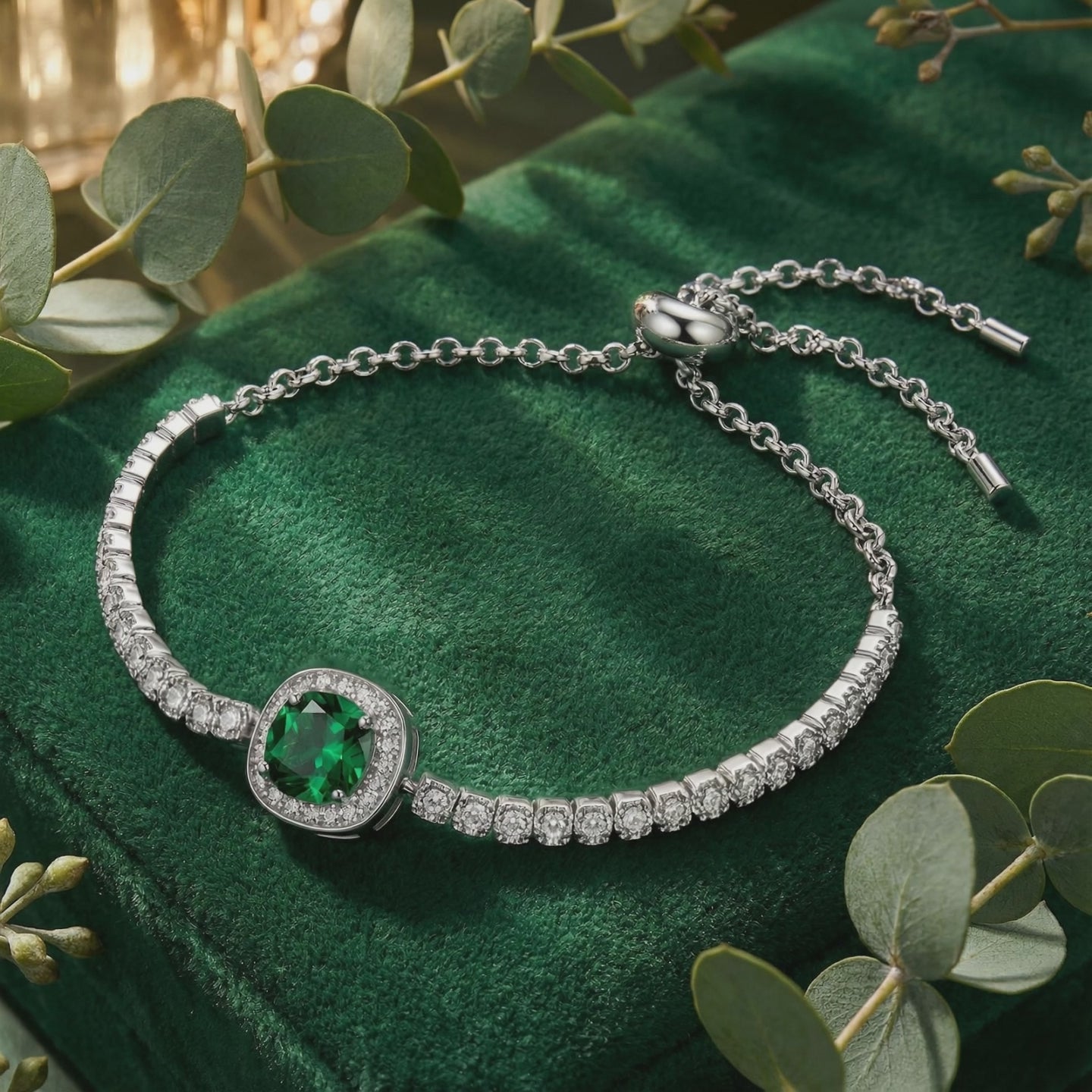 Mined emeralds are notoriously brittle and filled with visible cracks. We engineered a better way. This bracelet features a color-calibrated Simulated Emerald, precision-cut to match the deep, vivid green of museum-grade specimens. Every stone is selected for VVS clarity and flawless light return.