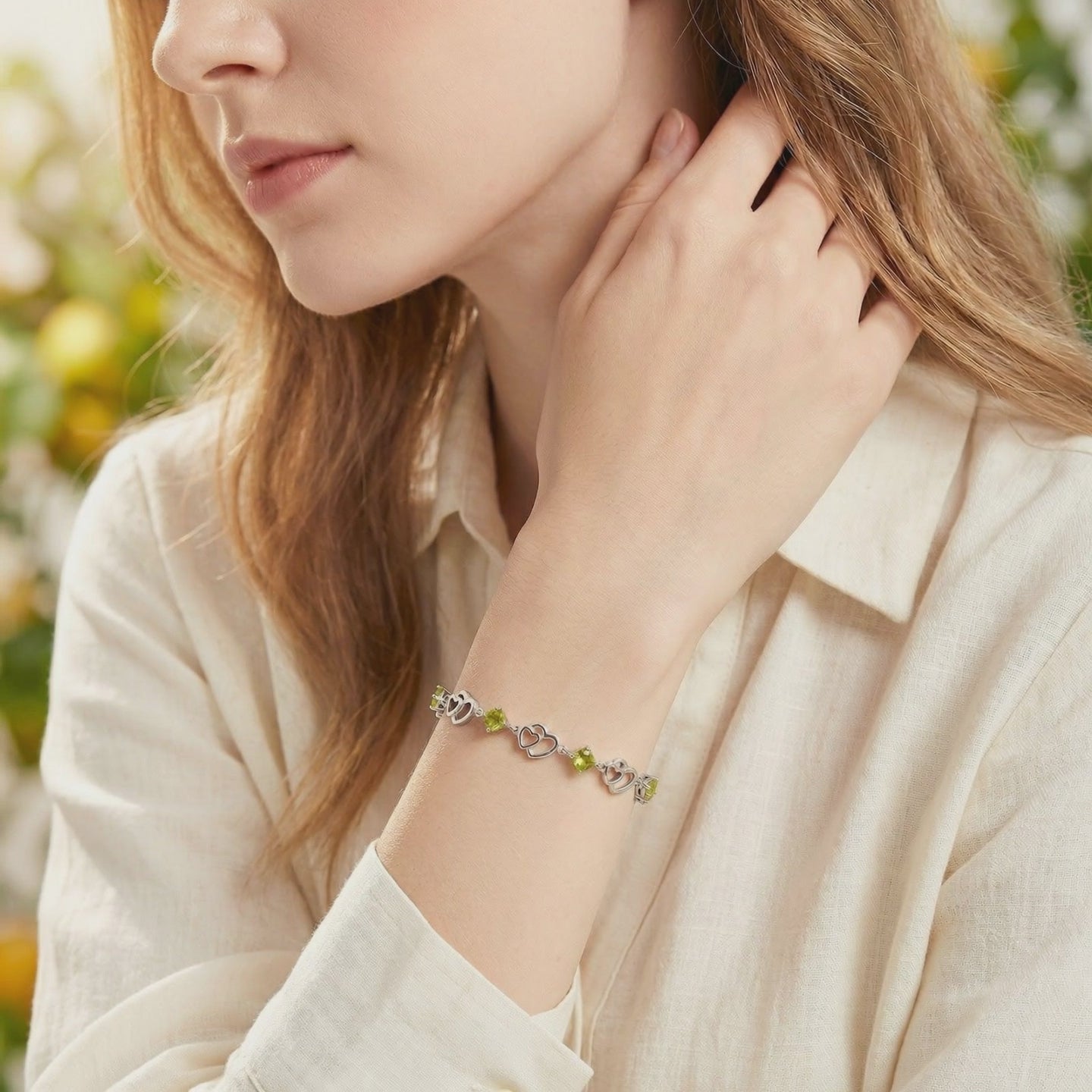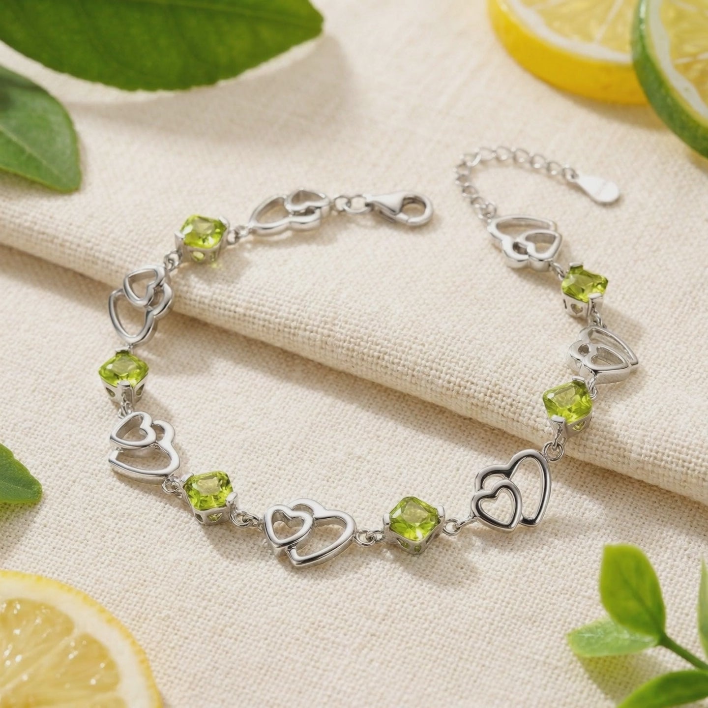 Close-up of sterling silver heart links and square-cut simulated peridot stones on the Perisella heart bracelet.