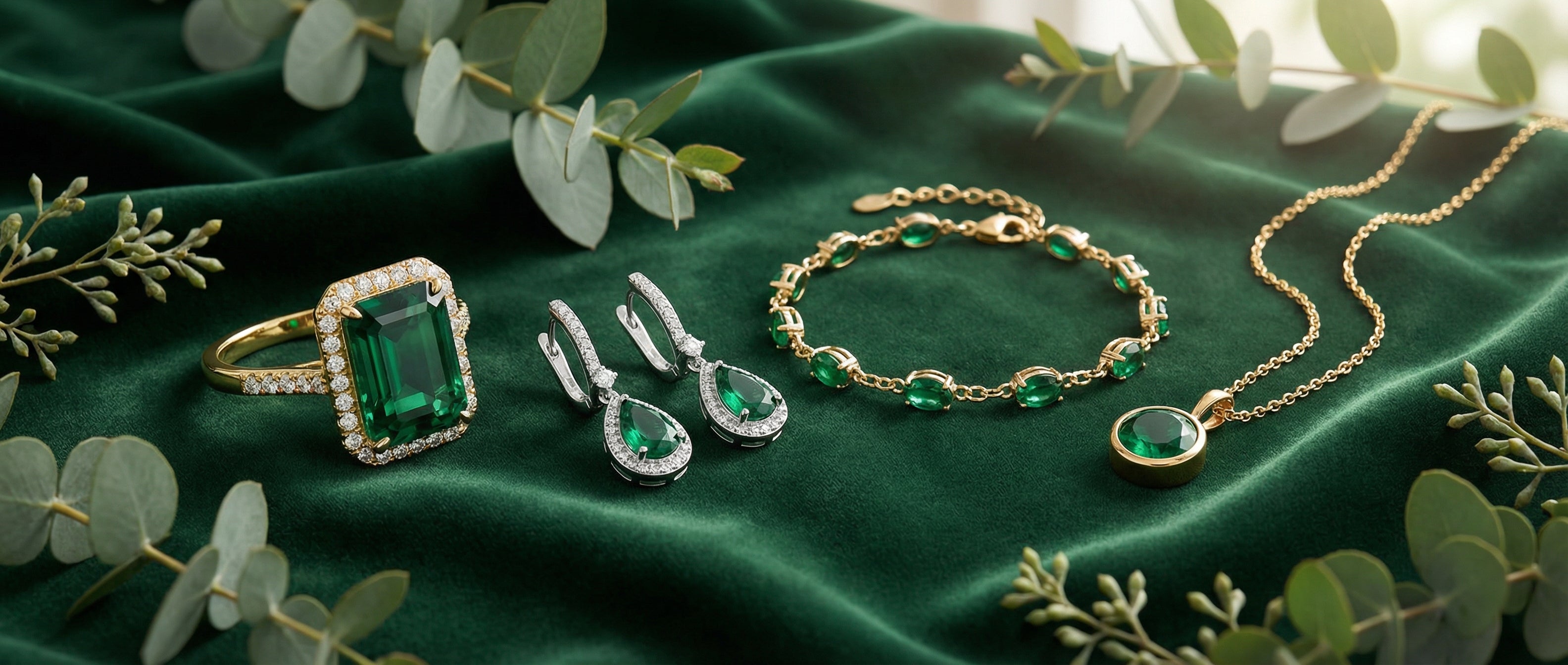 PromoEmerald-cut simulated emerald pendant in sterling silver on a green velvet box with eucalyptus leaves.