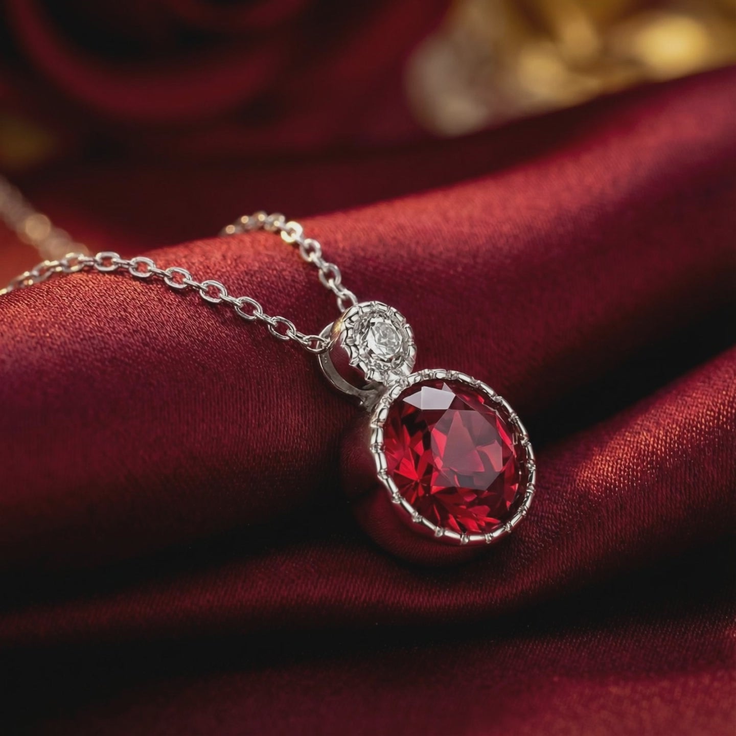 Macro view of the round cut pigeon blood simulated ruby and silver setting on red fabric.
