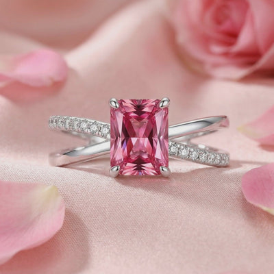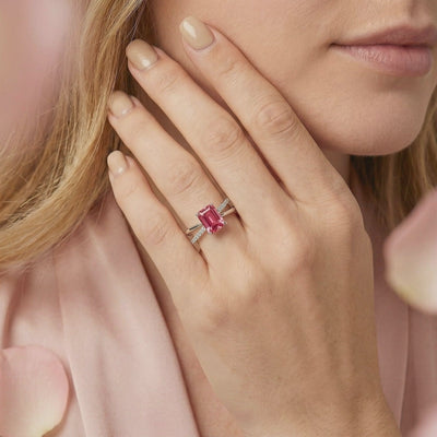 Angled view of the Elisenne radiant pink tourmaline silver ring featuring a pavé-set crossover bypass band.