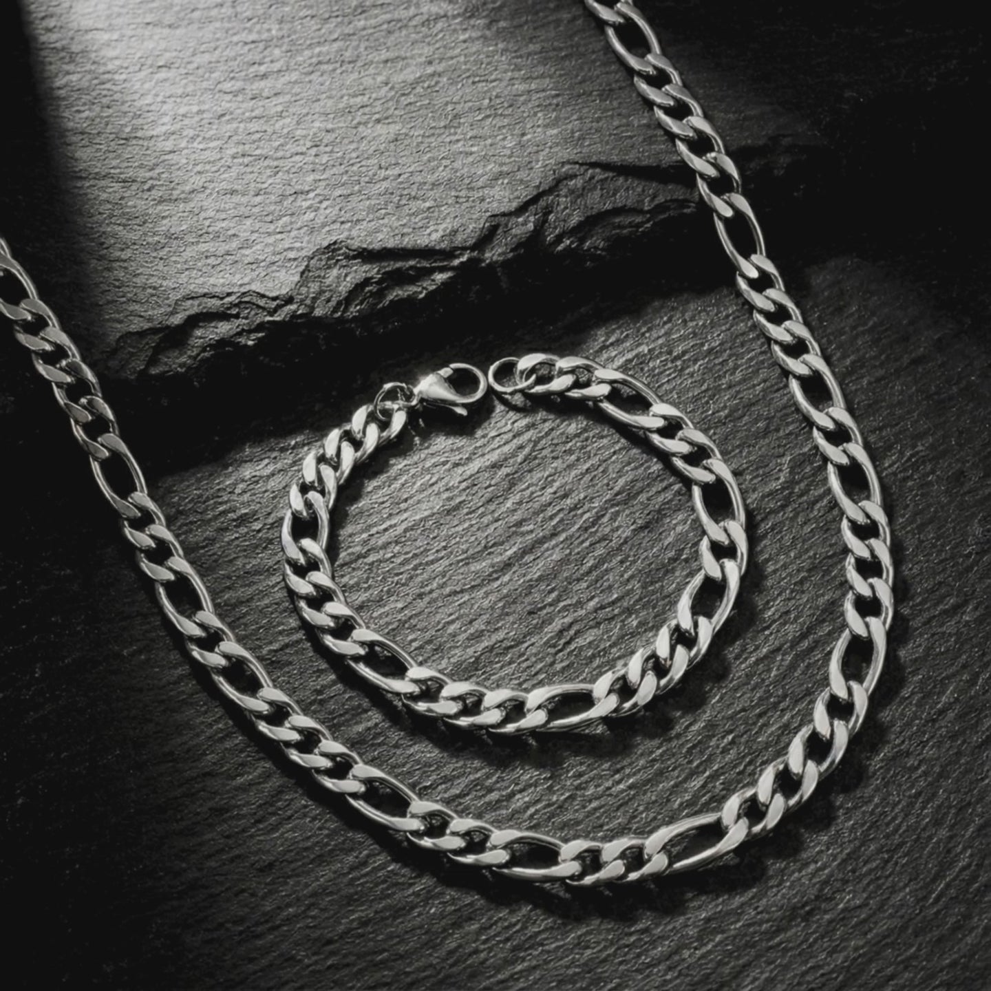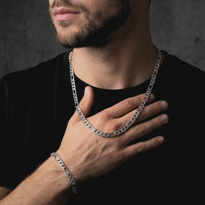 The Figaro Duo gives you a complete, rugged look. Made with premium stainless steel. Waterproof, durable, and built to last. This set includes both the Figaro chain and Figaro bracelet.