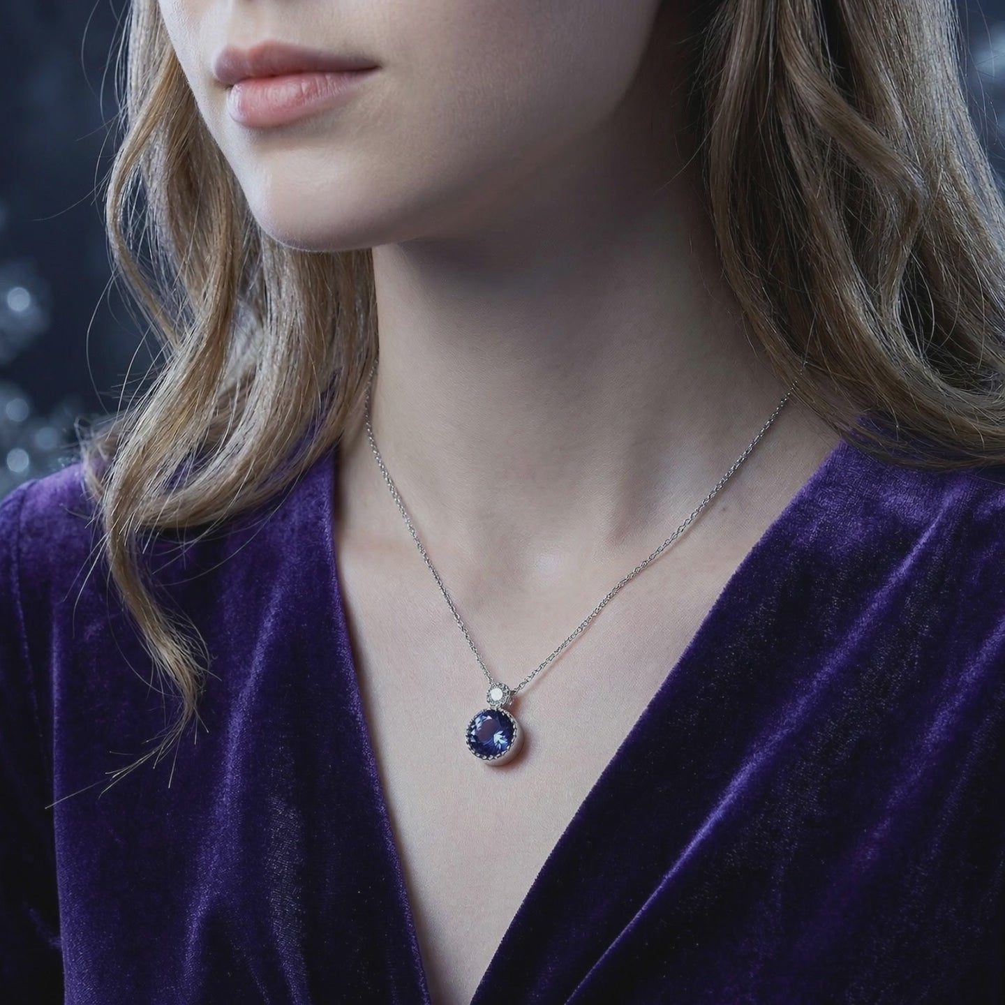 Macro shot of the round-cut simulated tanzanite pendant and sterling silver setting on purple velvet.