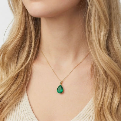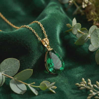 Gold vermeil necklace with a pear-shaped green emerald pendant displayed on green velvet among botanical leaves.