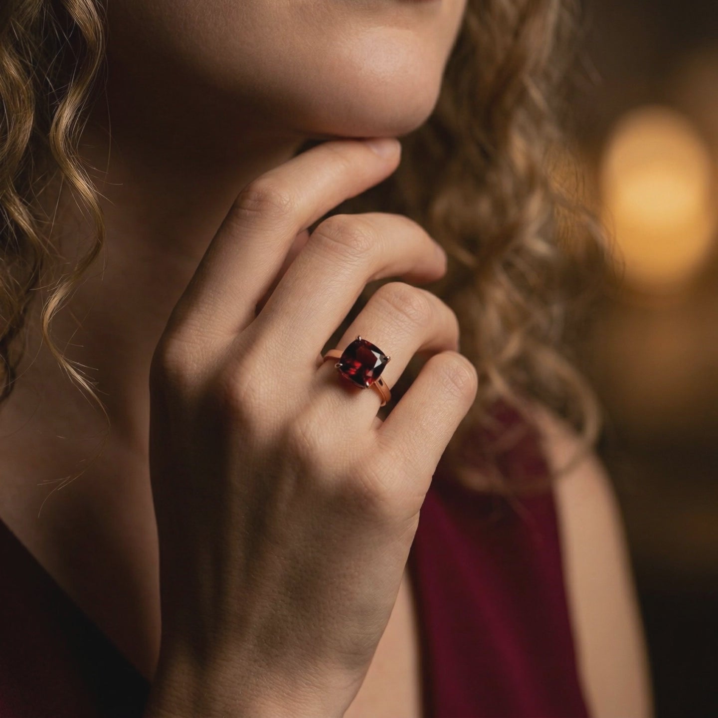 At the heart of this piece rests a massive 4.5-carat natural garnet. Forged over millions of years deep within the earth, this museum-quality gemstone has been precision-cut into a flawless 9x9mm cushion to maximize its light refraction. The result is a dynamic, concentrated glow—a deep, smoldering burgundy in the evening, and a vibrant, passionate crimson under the sun.