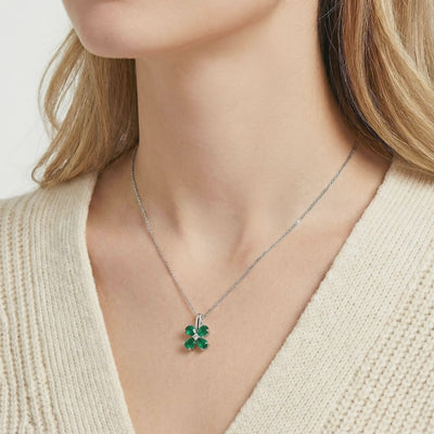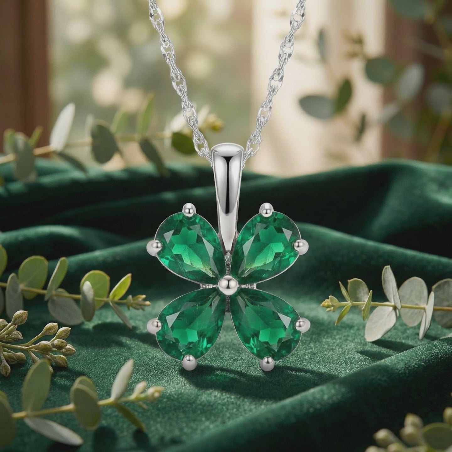 Mined emeralds are notoriously brittle and often clouded by internal fractures. We engineered a better way. This necklace features four precision-cut Simulated Emeralds, color-calibrated to the absolute ideal of a museum-grade gemstone. Each pear-cut stone is selected for its deep, flawless saturation, creating a perfect four-leaf clover silhouette that nature rarely delivers consistently.