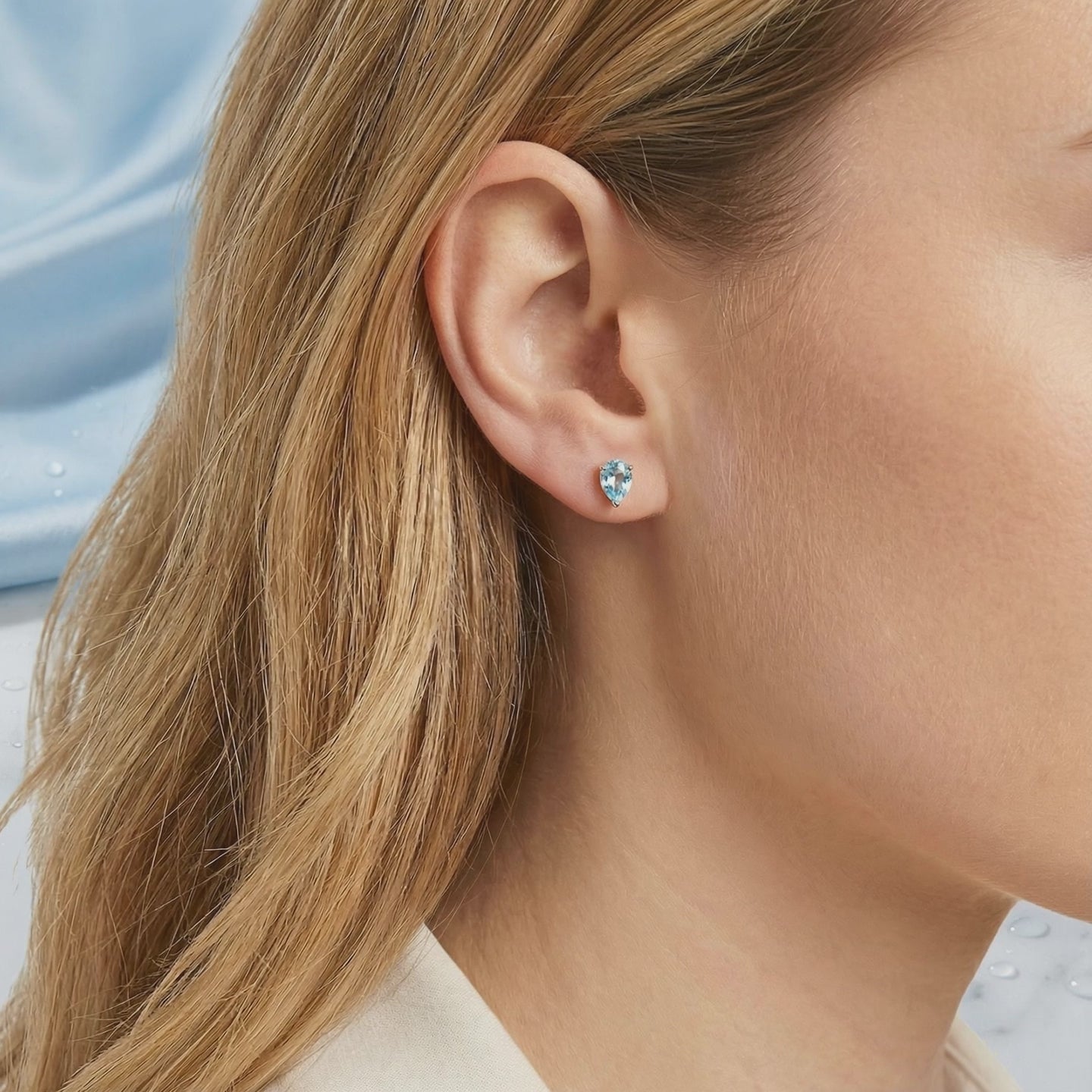 Macro shot of pear cut simulated aquamarine stones in 18K gold vermeil teardrop earring settings.