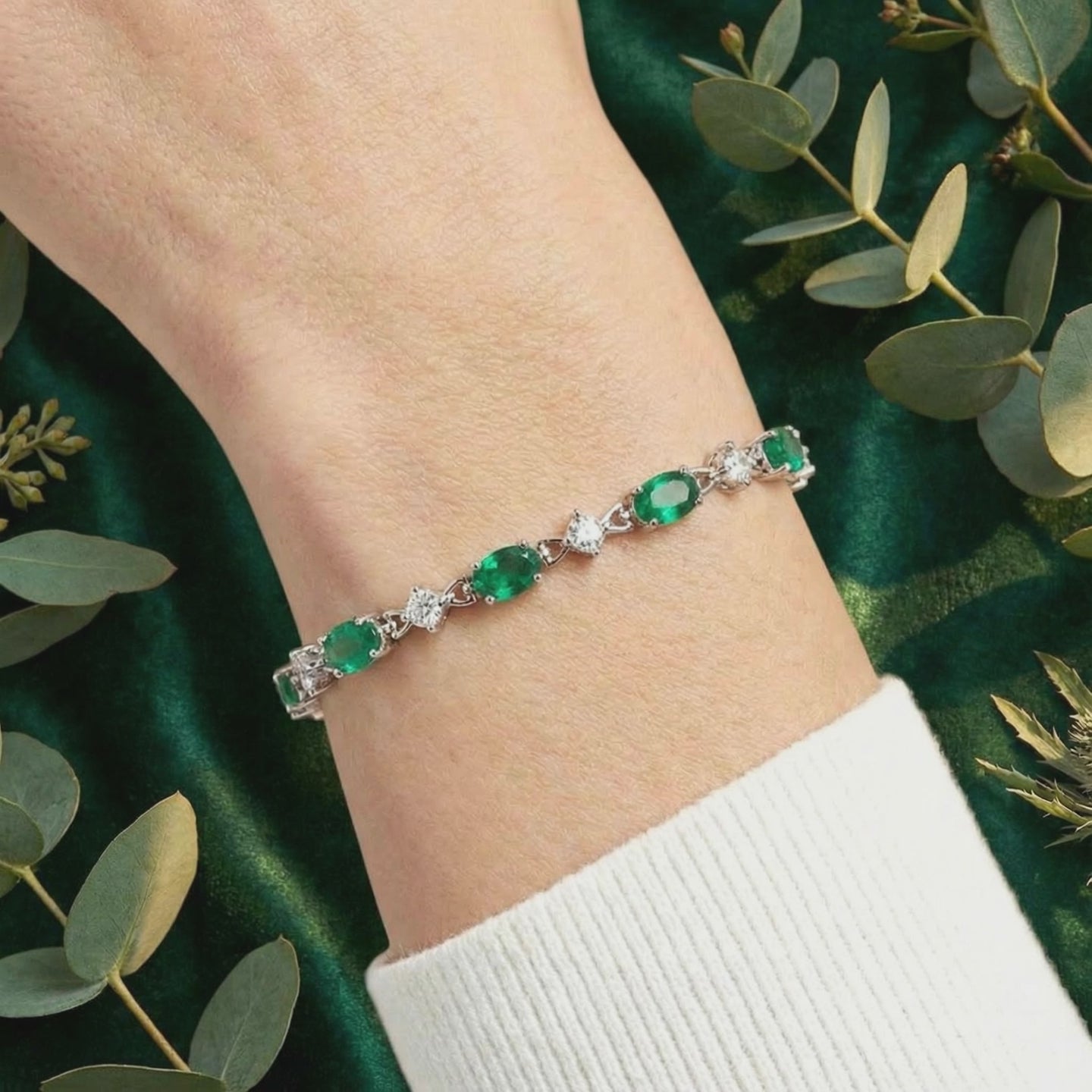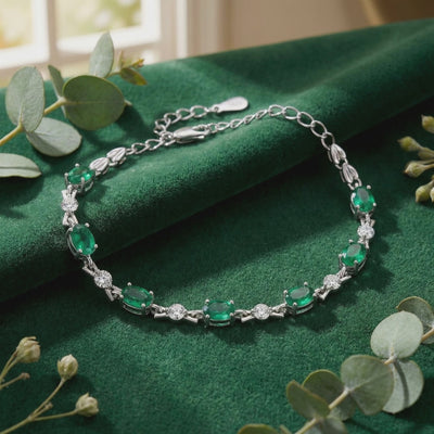 Nature rarely delivers perfection; engineering does. Mined emeralds are notoriously brittle and often clouded by inclusions. This May birthstone bracelet features Simulated Emerald, color-calibrated to match the deep, vivid green saturation of a museum-grade heirloom. Each oval stone is precision-cut from A5 Grade material to ensure maximum light return and uniform brilliance across the entire piece.