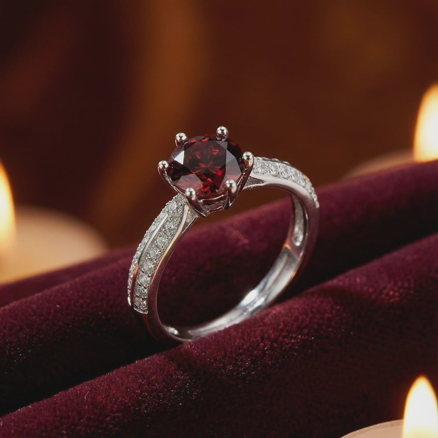 Angled macro view of a round cut simulated garnet and pavé side stones on a sterling silver ring setting.