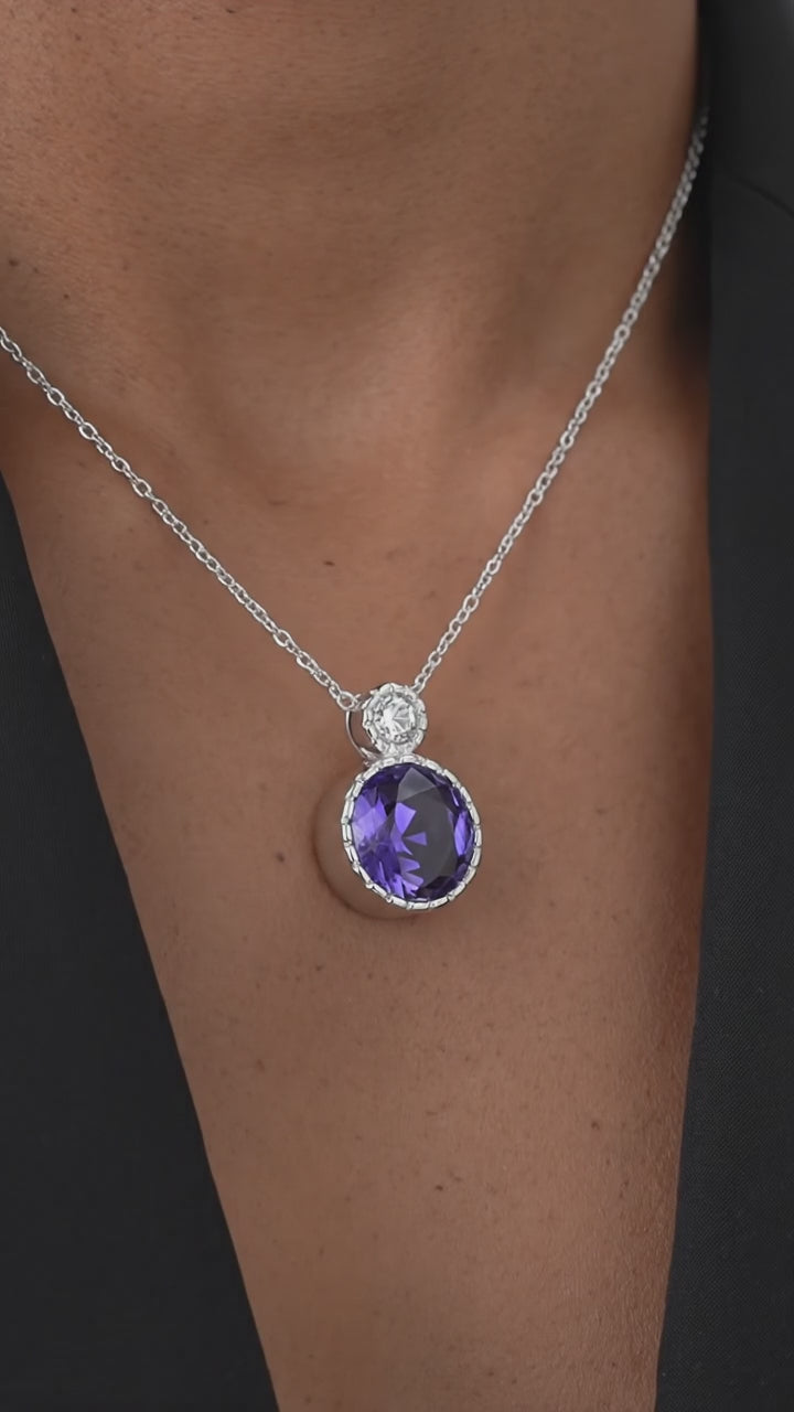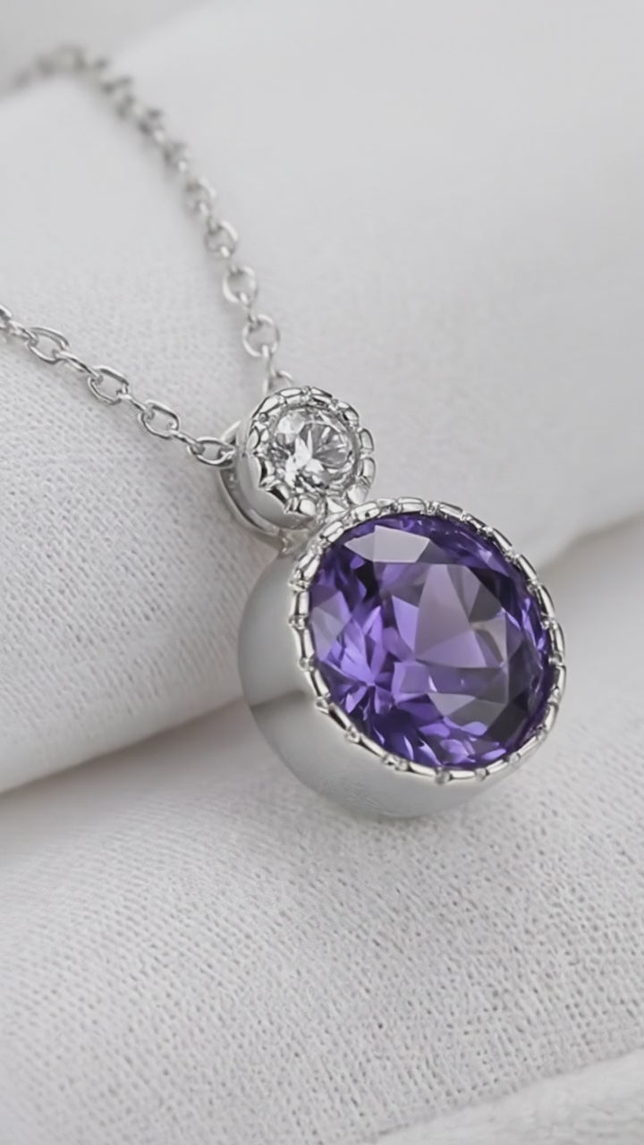 Model wearing the Elara round simulated amethyst drop necklace in sterling silver on a delicate chain.