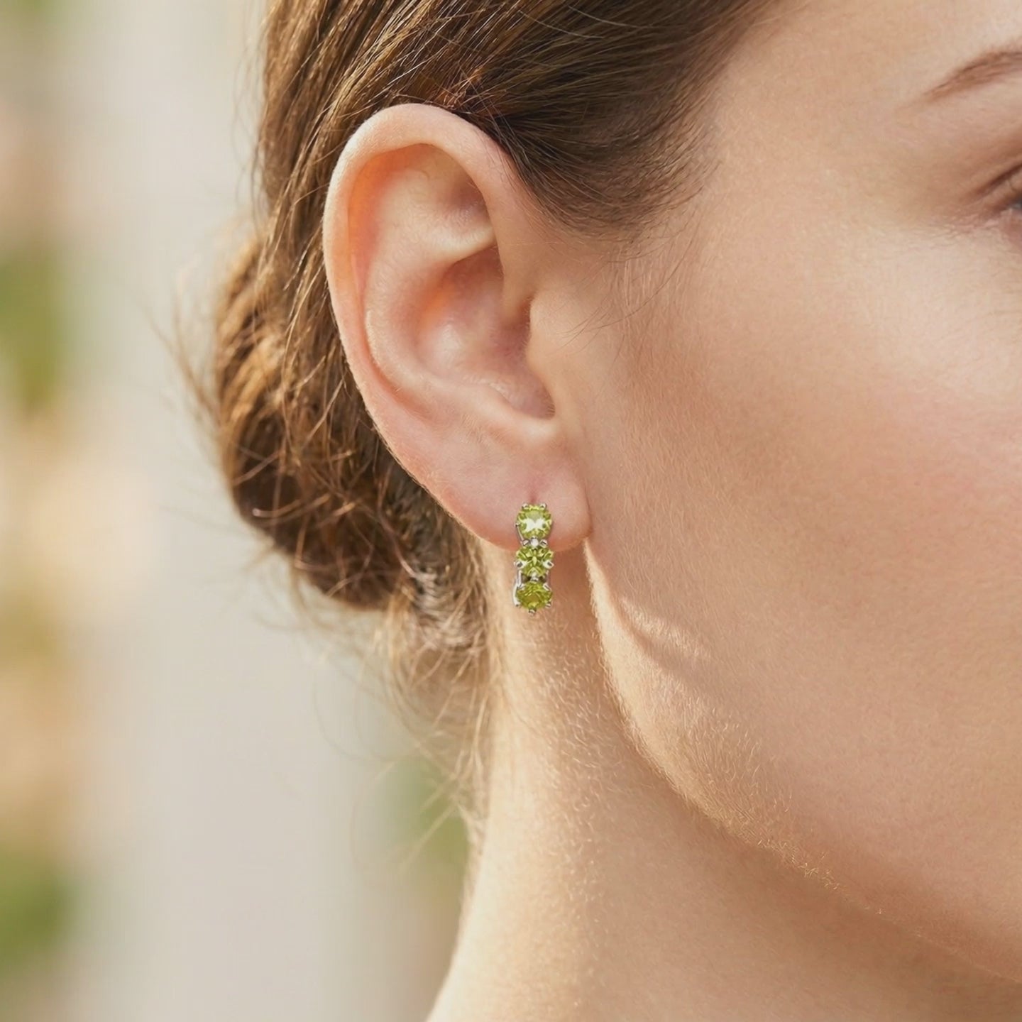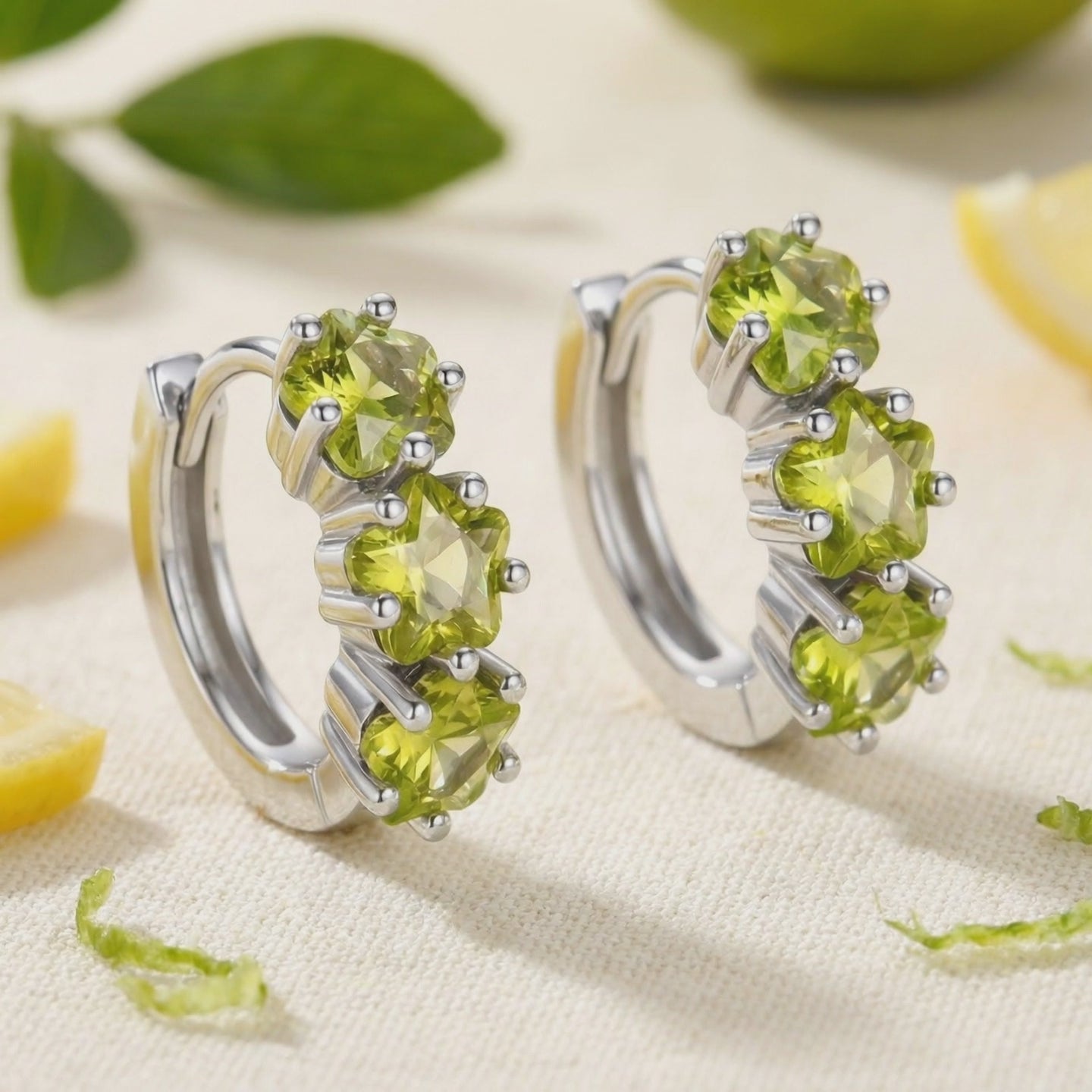 Front view of sterling silver hoop earrings featuring three star-cut green peridot stones on a styled background.