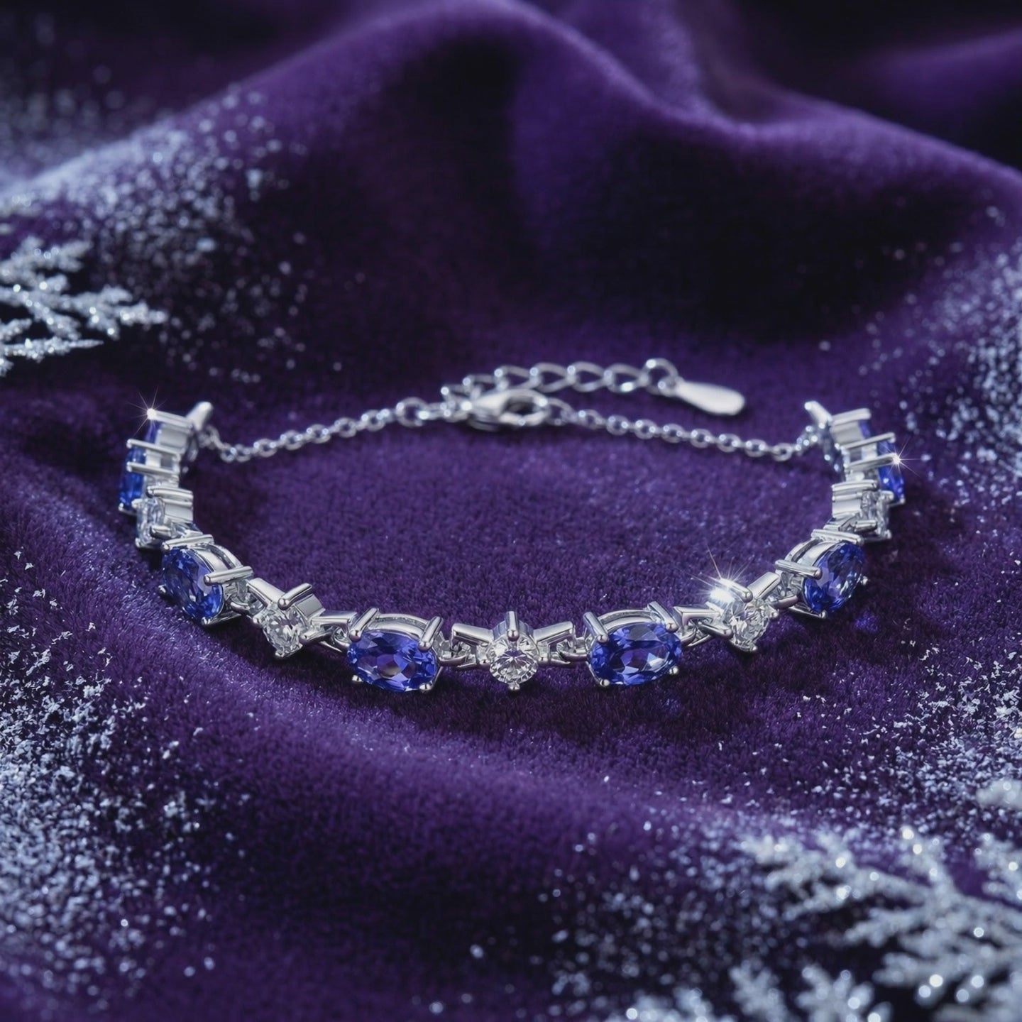 Top view of the sterling silver Zenelle station bracelet with oval-cut blue simulated tanzanite on purple velvet.