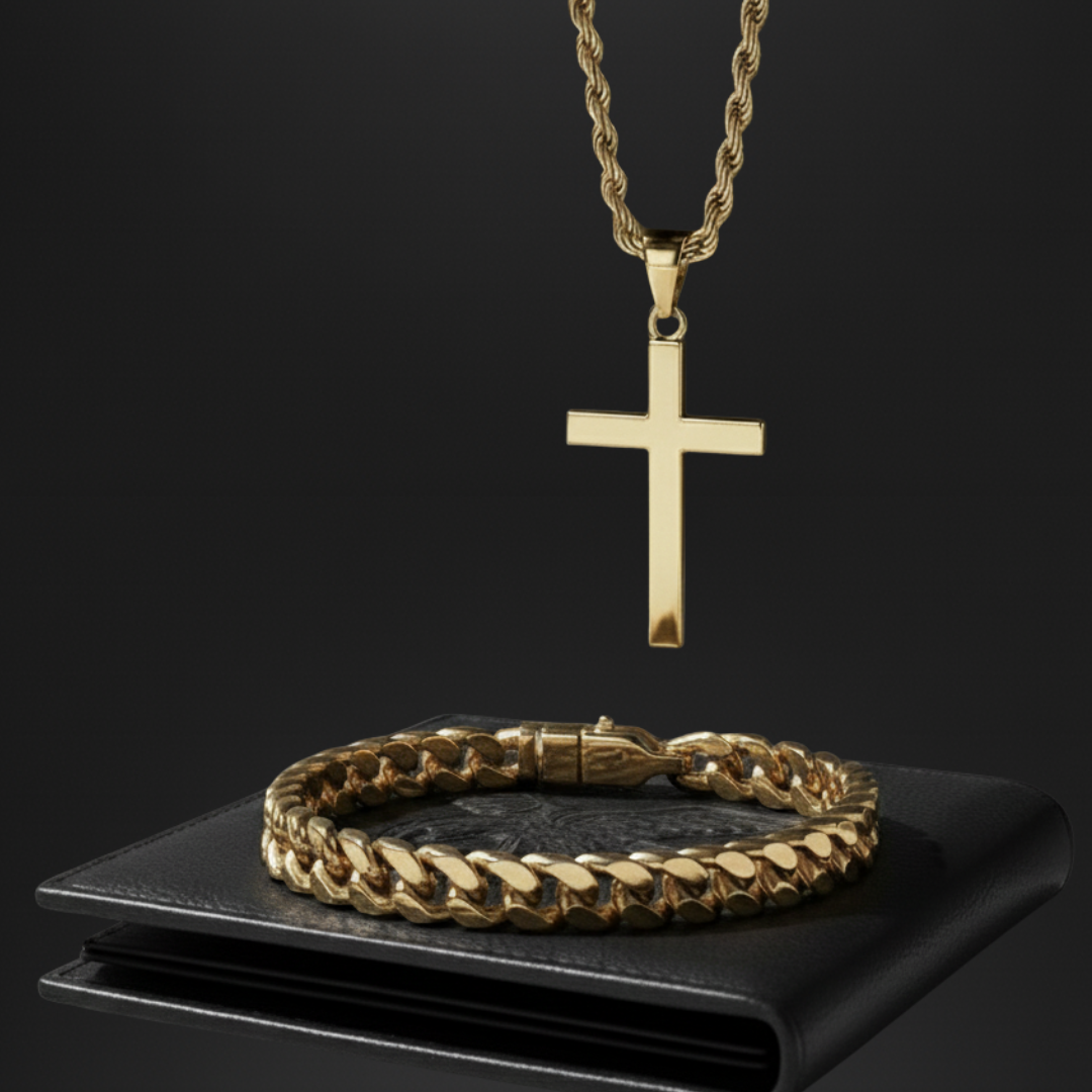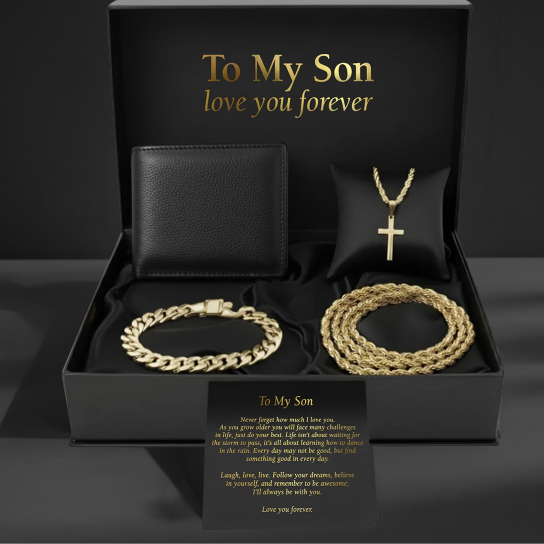 Inside: A complete set of gold jewelry (Cuban link bracelet, cross necklace, rope chain), a premium leather wallet, and a personalized "Love You Forever" message card, all coordinated, all meaningful, all ready to gift.
