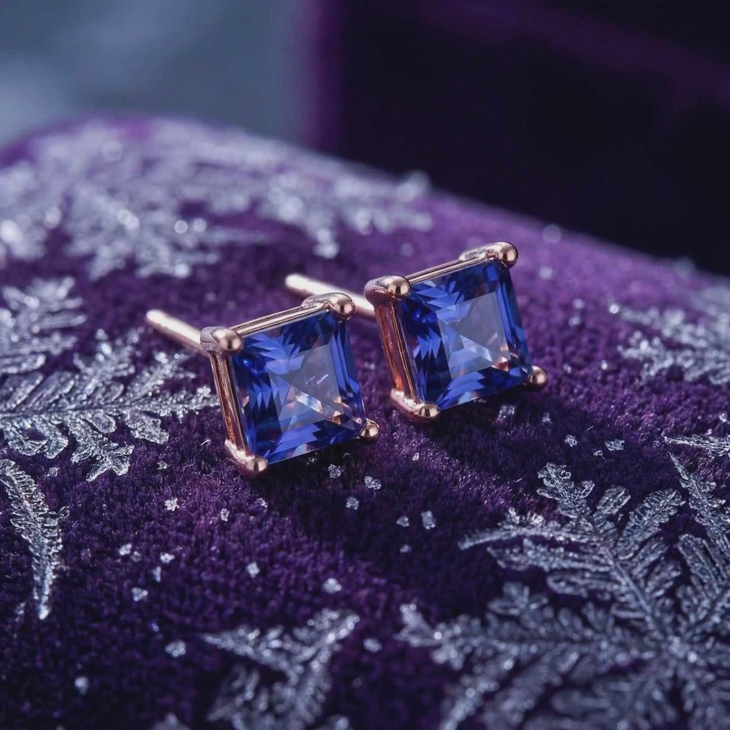 Nature rarely delivers the perfect trichroic shifting hues of a museum-grade Tanzanite. We engineered it. These princess-cut stud earrings feature Simulated Tanzanite, color-calibrated to the ideal saturation—balancing deep royal blue with distinct violet flashes for maximum visual impact.