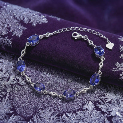 Close-up of oval-cut simulated tanzanite stones and sterling silver links on the Melisara station bracelet.
