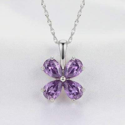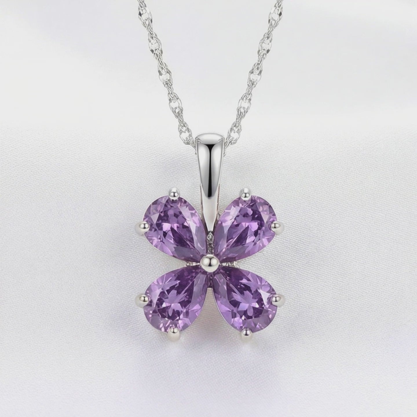Close-up of the Amity clover pendant showing the S925 sterling silver setting and faceted purple simulated amethysts.